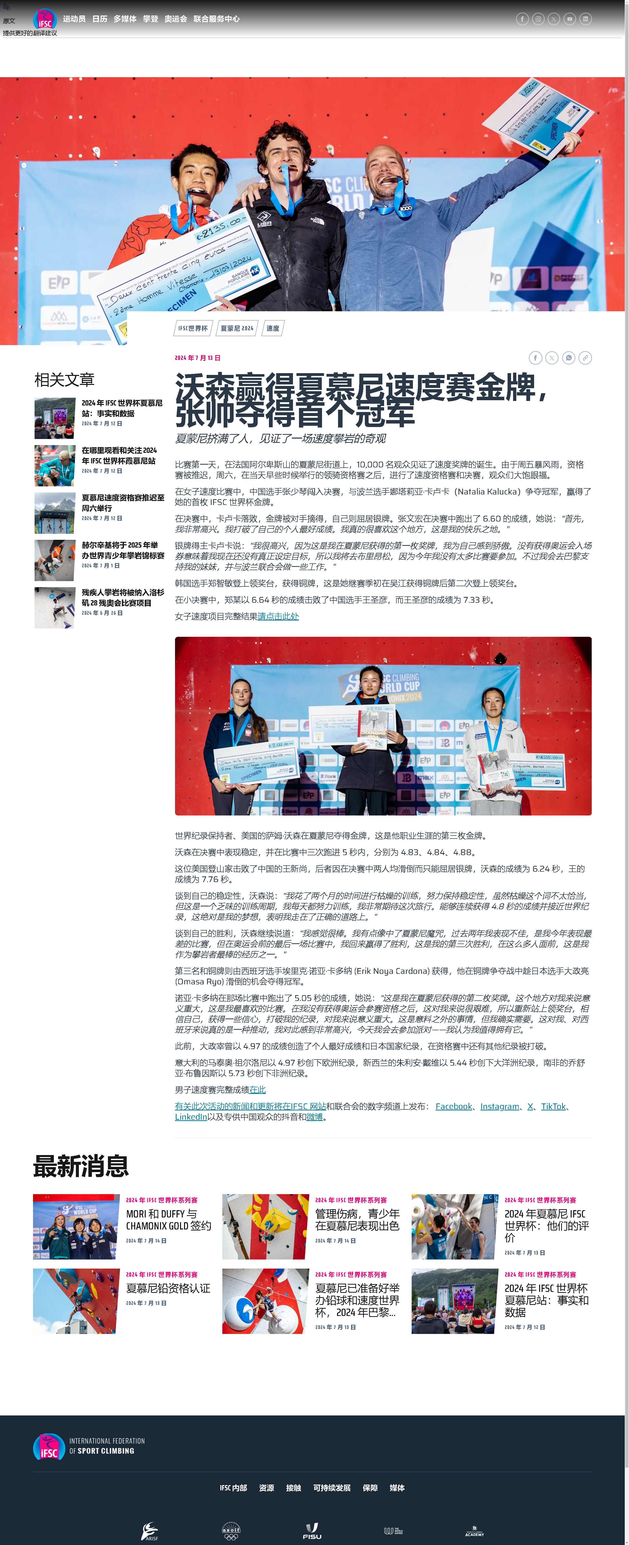 中國(guó)選手張少琴(中)在2024攀巖世界杯法國(guó)夏蒙尼站中獲得女子速度項(xiàng)目冠軍。圖源:國(guó)際攀聯(lián)官網(wǎng)