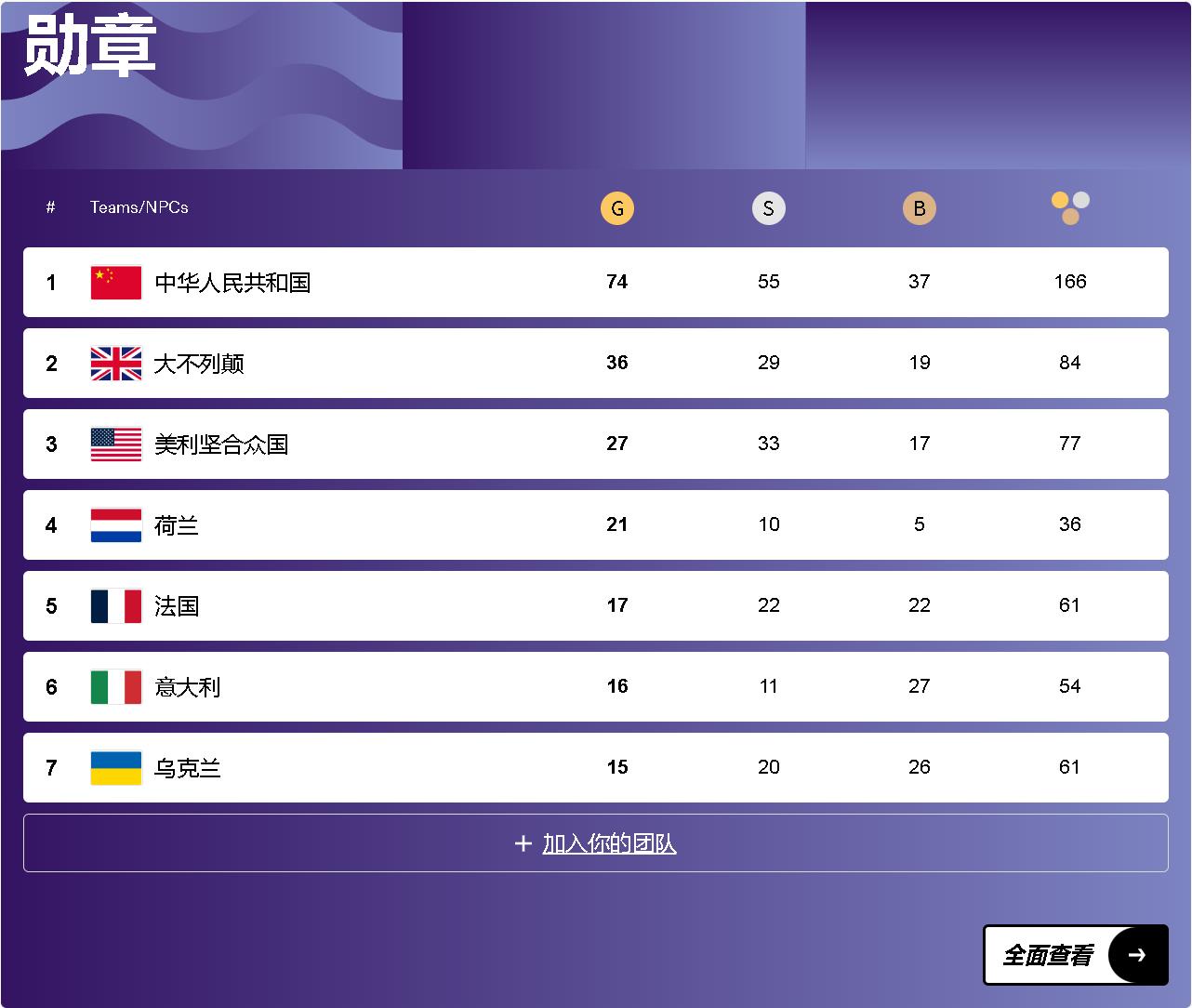 目前中國代表團(tuán)以74金55銀37銅繼續(xù)領(lǐng)跑金牌榜,英國隊(duì)、美國隊(duì)分列二、三位。