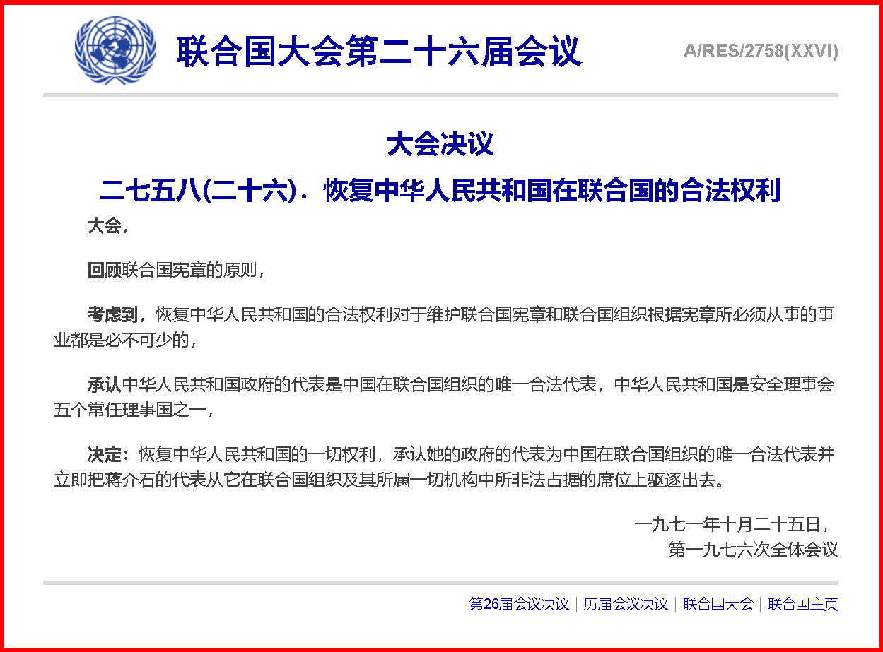 王毅說,臺灣是中國領(lǐng)土不可分割的一部分,這既是歷史,也是現(xiàn)實?!堕_羅宣言》《波茨坦公告》明確規(guī)定把日本竊取的中國領(lǐng)土,包括臺灣、澎湖列島歸還中國,構(gòu)成了二戰(zhàn)后國際秩序的重要組成部分。53年前,就是在這座神圣莊嚴的大廳,第26屆聯(lián)合國大會以壓倒性多數(shù)通過第2758號決議,決定恢復(fù)中華人民共和國在聯(lián)合國的一切權(quán)利,承認中華人民共和國政府代表是中國在聯(lián)合國唯一合法代表,并立即把臺灣地區(qū)的代表從聯(lián)合國及其所屬一切機構(gòu)中驅(qū)逐出去。這一決議徹底解決了包括臺灣在內(nèi)全中國在聯(lián)合國的代表權(quán)問題,明確不存在“兩個中國”,不存在“一中一臺”。在這一原則問題上,沒有灰色地帶,沒有模糊空間。中國必將實現(xiàn)完全統(tǒng)一,臺灣必將回歸祖國懷抱,這是任何人、任何勢力都阻擋不了的歷史大勢!