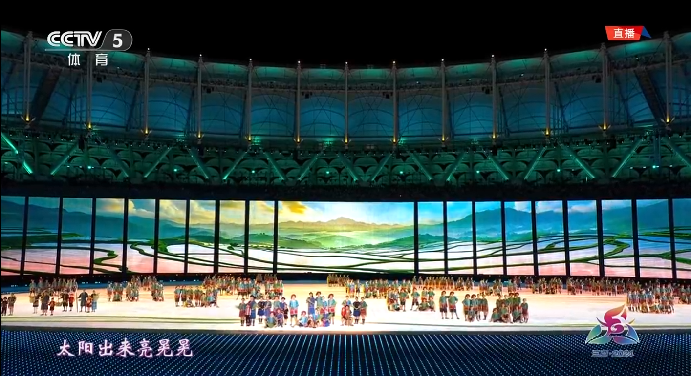 舞臺中間是一個圓形地屏,地屏外圈,導演組專門增加“星空矩形”地毯,圍繞中心地屏影像始終保持圓形圖案,構成“同心圓”;在入場儀式、節(jié)目展演、點燃火炬等多個環(huán)節(jié),身穿各民族傳統(tǒng)服飾的參賽人員、表演者等,多次在舞臺匯聚成“同心圓”;“一顆心,一個圓,一齊擁抱緊相連……”“同心圓”概念也在主題曲中彰顯。