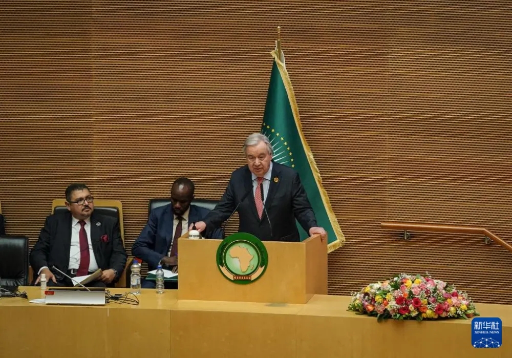 2月15日,在埃塞俄比亞首都亞的斯亞貝巴,聯(lián)合國(guó)秘書長(zhǎng)古特雷斯在開幕式上發(fā)言。