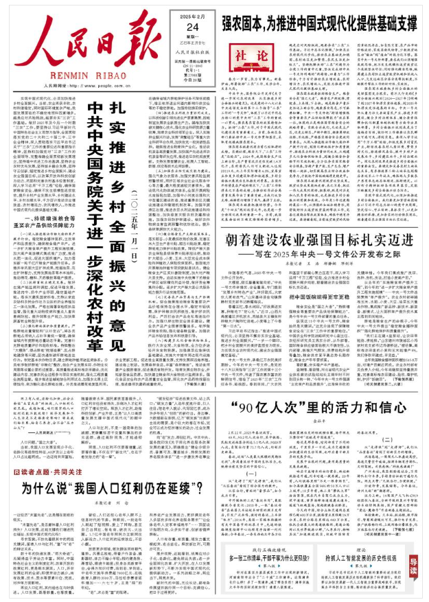 中共中央、國務院公開發(fā)布《關(guān)于進一步深化農(nóng)村改革 扎實推進鄉(xiāng)村全面振興的意見》。這是黨的十八大以來中央連續(xù)發(fā)出的第十三個指導“三農(nóng)”工作的“一號文件”,體現(xiàn)了以習近平同志為核心的黨中央對“三農(nóng)”工作的重視一以貫之,強農(nóng)惠農(nóng)富農(nóng)的政策持續(xù)加力。抓好“三農(nóng)”工作,對于中國式現(xiàn)代化建設具有重要意義。當前,各地區(qū)各部門要抓好中央一號文件貫徹落實,采取有效措施強農(nóng)固本。