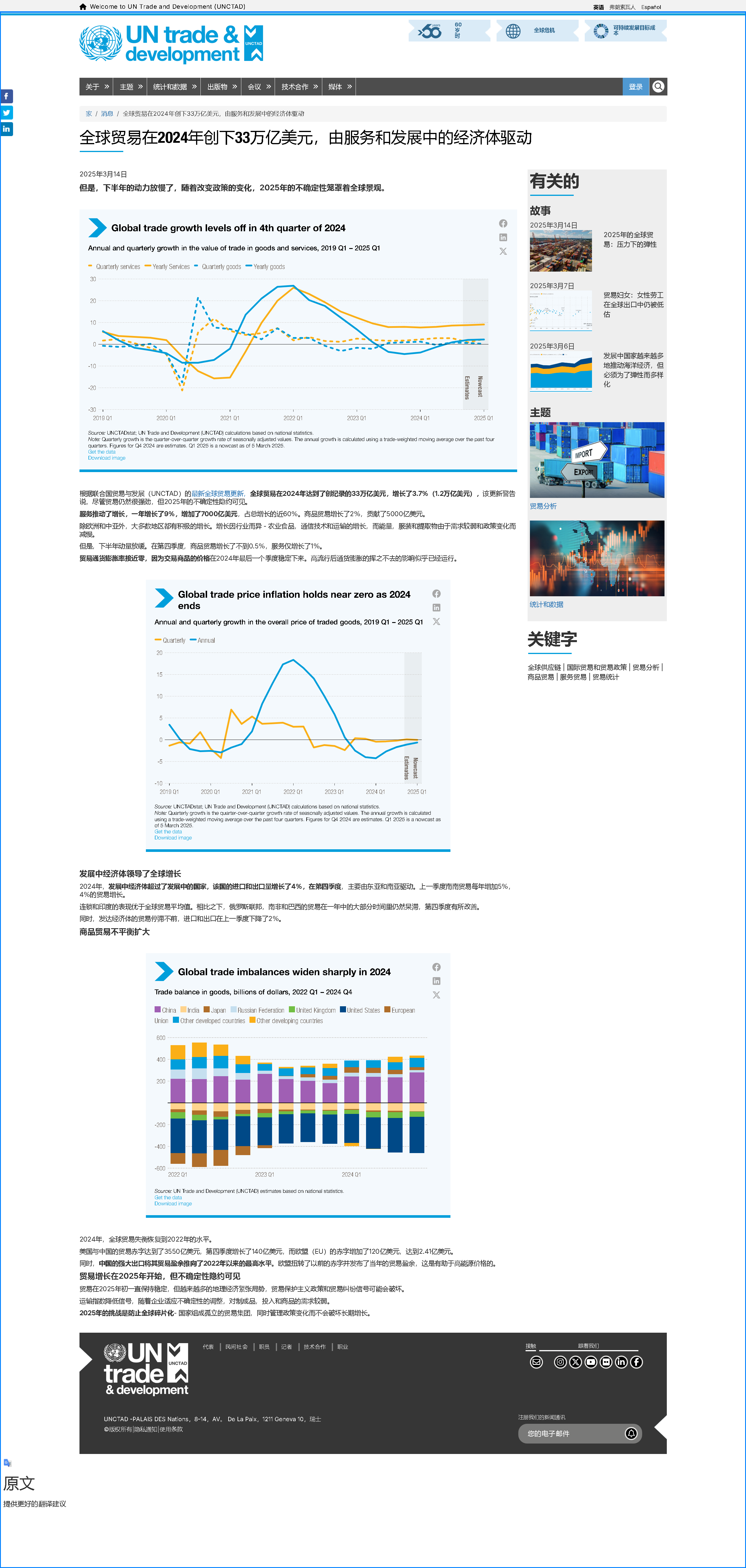 新華社日內(nèi)瓦3月15日電 聯(lián)合國(guó)貿(mào)易和發(fā)展會(huì)議(貿(mào)發(fā)會(huì)議)14日發(fā)布報(bào)告顯示,2024年全球貿(mào)易額達(dá)到33萬億美元新高,較2023年增長(zhǎng)3.7%,但貿(mào)易增長(zhǎng)勢(shì)頭在2024年下半年有所放緩。
