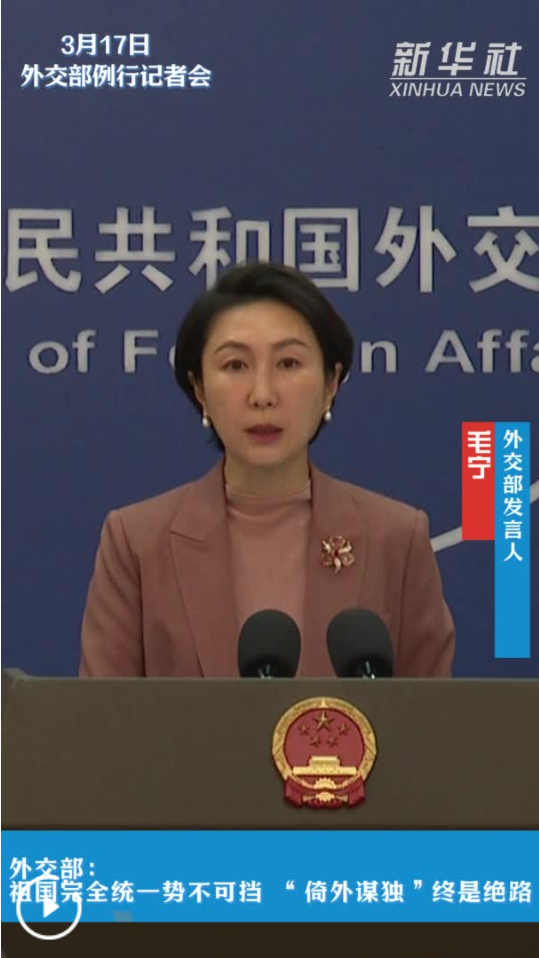 新華社北京3月17日電(記者朱超、白鑫雨)外交部發(fā)言人毛寧17日表示,祖國完全統(tǒng)一勢不可擋,“倚外謀獨”終是絕路。希望有關(guān)國家認清臺灣當(dāng)局險惡用心,以實際行動嚴格恪守一個中國原則,切實維護雙邊關(guān)系政治基礎(chǔ)。