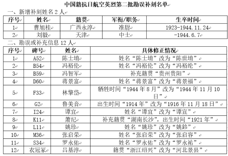 目前,紀(jì)念館累計(jì)完成32位中國籍抗日航空英烈姓名的增補(bǔ)和勘誤工作。