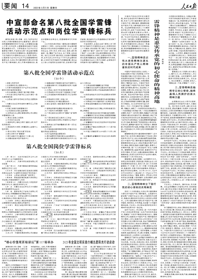新華社北京3月4日電 近日,習(xí)近平總書記對深入開展學(xué)雷鋒活動作出重要指示,要求深刻把握雷鋒精神的時代內(nèi)涵,讓學(xué)雷鋒活動融入日常、化作經(jīng)常,讓雷鋒精神在新時代綻放更加璀璨的光芒。為貫徹落實(shí)習(xí)近平總書記重要指示精神,中宣部命名第八批全國學(xué)雷鋒活動示范點(diǎn)和崗位學(xué)雷鋒標(biāo)兵,強(qiáng)調(diào)要堅持以習(xí)近平新時代中國特色社會主義思想為指導(dǎo),認(rèn)真貫徹習(xí)近平總書記關(guān)于弘揚(yáng)雷鋒精神的重要論述,弘揚(yáng)以偉大建黨精神為源頭的中國共產(chǎn)黨人精神譜系,深入開展學(xué)雷鋒活動,推動學(xué)雷鋒活動常態(tài)化,把雷鋒精神代代傳承下去。