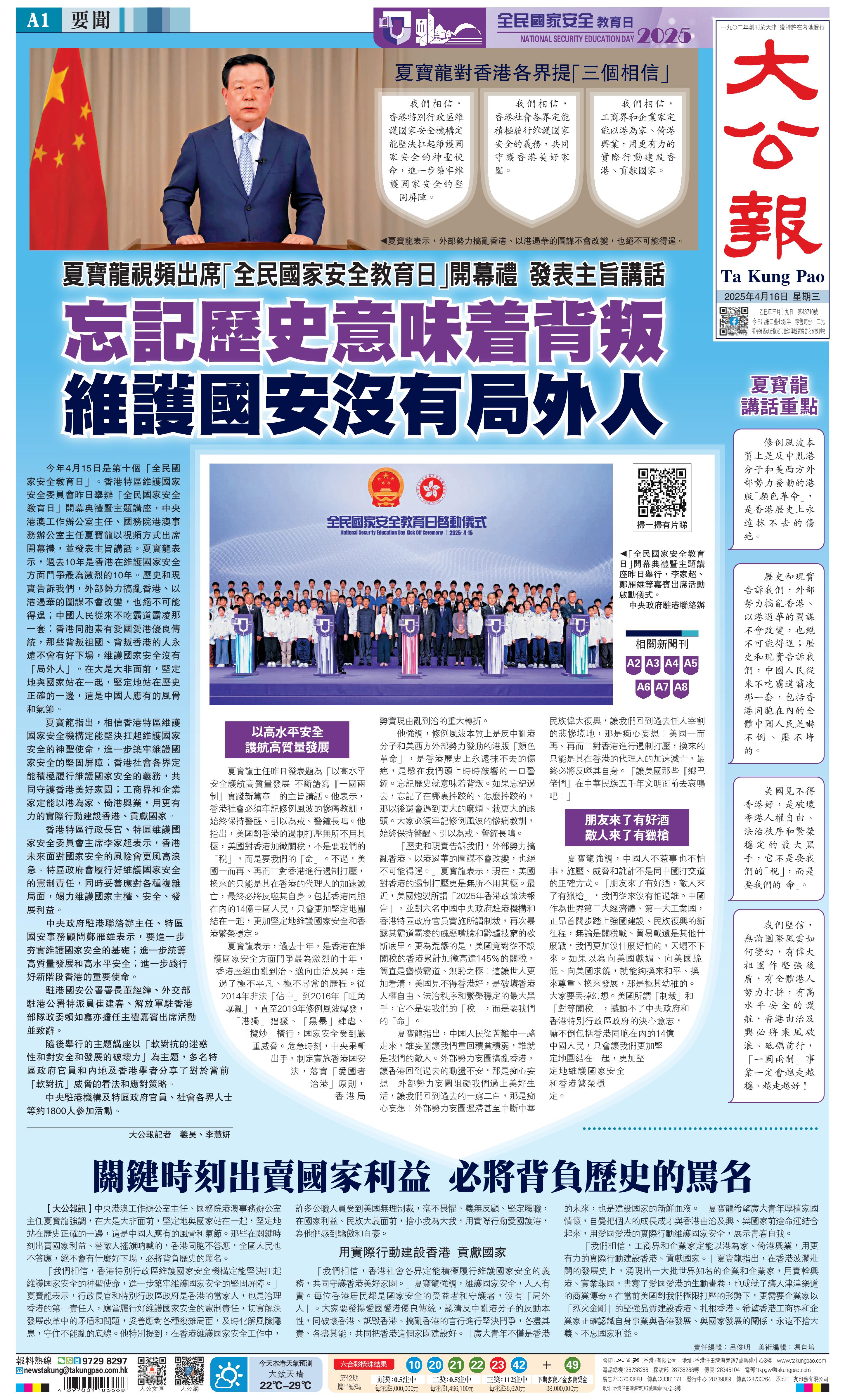 「我們相信,香港社會各界定能積極履行維護國家安全的義務,共同守護香港美好家園?!瓜膶汖垙娬{,維護國家安全,人人有責。每位香港居民都是國家安全的受益者和守護者,沒有「局外人」。大家要發(fā)揚愛國愛港優(yōu)良傳統(tǒng),認清反中亂港分子的反動本性,同破壞香港、詆毀香港、搞亂香港的言行進行堅決斗爭,各盡其責、各盡其能,共同把香港這個家園建設好。 「廣大青年不僅是香港的未來,也是建設國家的新鮮血液。」夏寶龍希望廣大青年厚植家國情懷,自覺把個人的成長成才與香港由治及興、與國家前途命運結合起來,用愛國愛港的實際行動維護國家安全,展示青春自我。