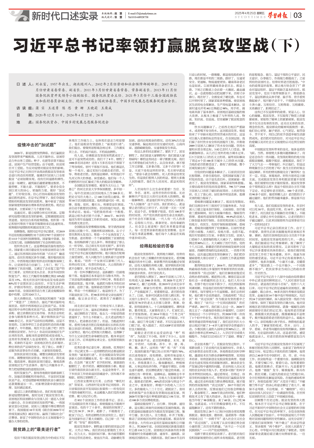 口述人:劉永富,1957年出生,湖北隨州人。2002年2月任勞動和社會保障部副部長。2007年12月任甘肅省委常委、副省長。2011年3月任甘肅省委常委、常務(wù)副省長。2013年11月任國務(wù)院扶貧開發(fā)領(lǐng)導(dǎo)小組副組長、國務(wù)院扶貧辦主任。2021年3月任十三屆全國政協(xié)農(nóng)業(yè)和農(nóng)村委員會副主任?,F(xiàn)任十四屆全國政協(xié)委員,中國鄉(xiāng)村發(fā)展志愿服務(wù)促進(jìn)會會長。