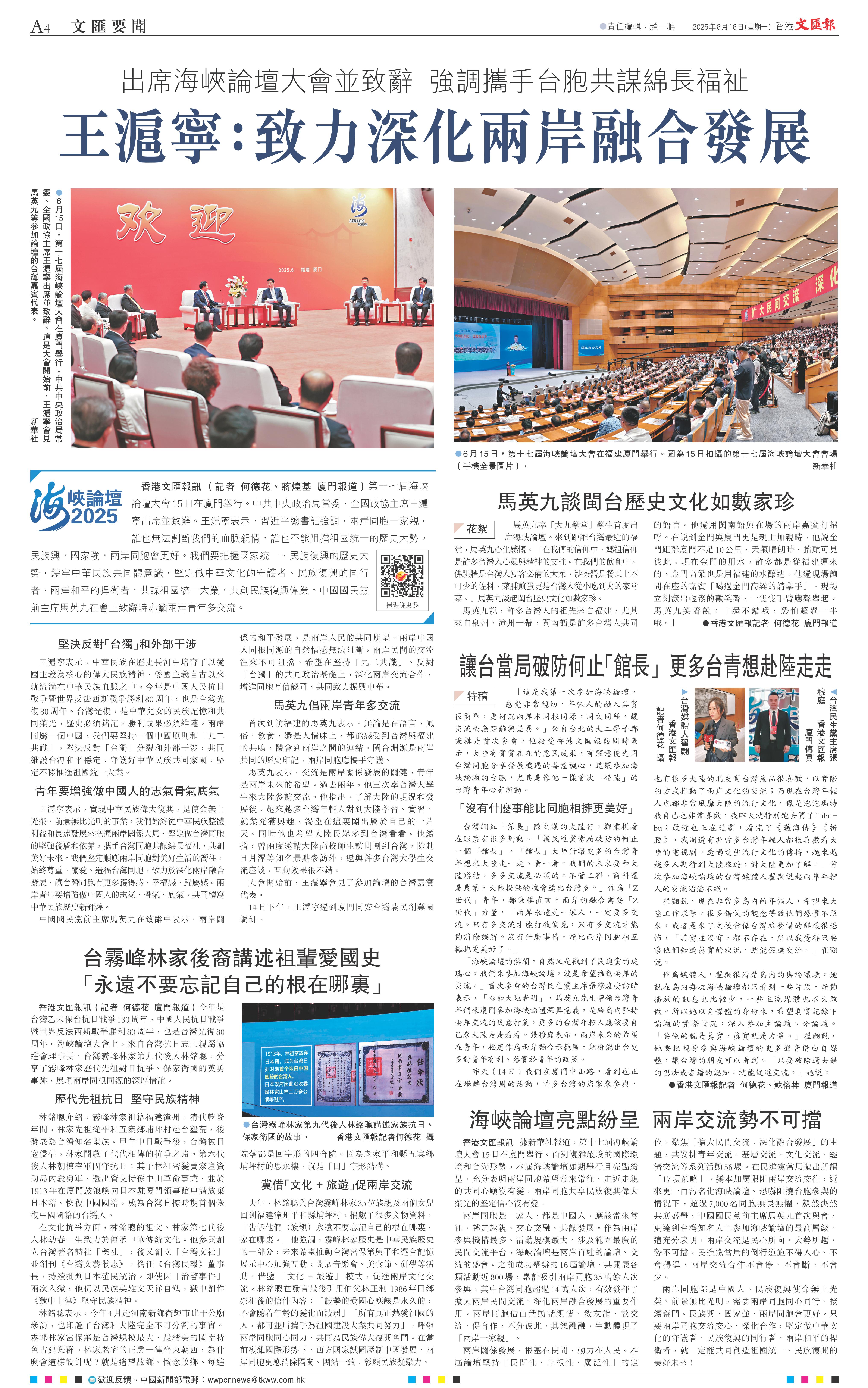 王滬寧表示,實現(xiàn)中華民族偉大復(fù)興,是使命無上光榮、前景無比光明的事業(yè)。我們始終從中華民族整體利益和長遠發(fā)展來把握兩岸關(guān)系大局,堅定做臺灣同胞的堅強后盾和依靠,攜手臺灣同胞共謀綿長福祉、共創(chuàng)美好未來。我們堅定順應(yīng)兩岸同胞對美好生活的向往,始終尊重、關(guān)愛、造福臺灣同胞,致力于深化兩岸融合發(fā)展,讓臺灣同胞有更多獲得感、幸福感、歸屬感。兩岸青年要增強做中國人的志氣、骨氣、底氣,共同續(xù)寫中華民族歷史新輝煌。
