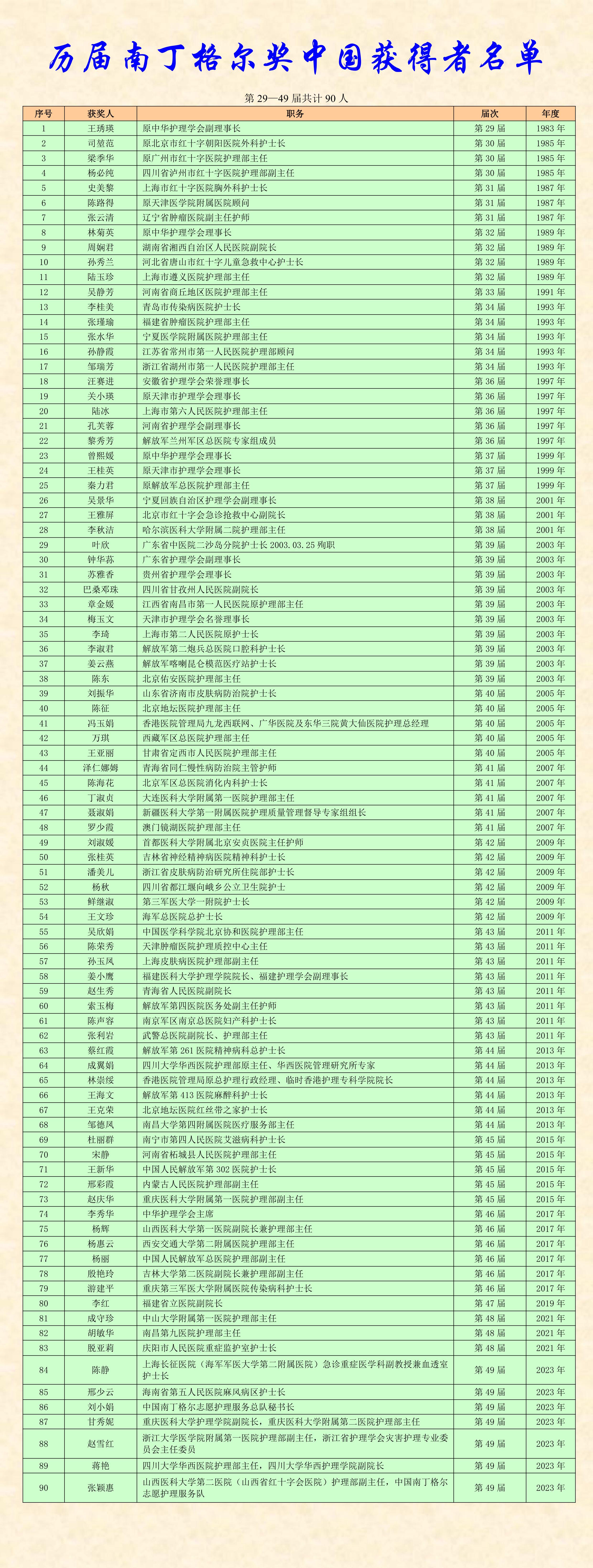 南丁格爾獎是紅十字國際委員會為紀(jì)念佛羅倫斯·南丁格爾在改善戰(zhàn)地傷病人員護(hù)理方面做出的卓越貢獻(xiàn)而設(shè)立的國際護(hù)理界最高榮譽(yù)獎。南丁格爾獎候選人要求長期從事護(hù)理工作或護(hù)理志愿服務(wù)工作,具有高尚的思想道德素養(yǎng)和高超的護(hù)理專業(yè)水平,在重大突發(fā)事件緊急救援或特殊疾病護(hù)理工作中表現(xiàn)出非凡的勇氣和獻(xiàn)身精神。我國自1983年參與第29屆南丁格爾獎評選以來,已有90位優(yōu)秀護(hù)理工作者獲此殊榮。