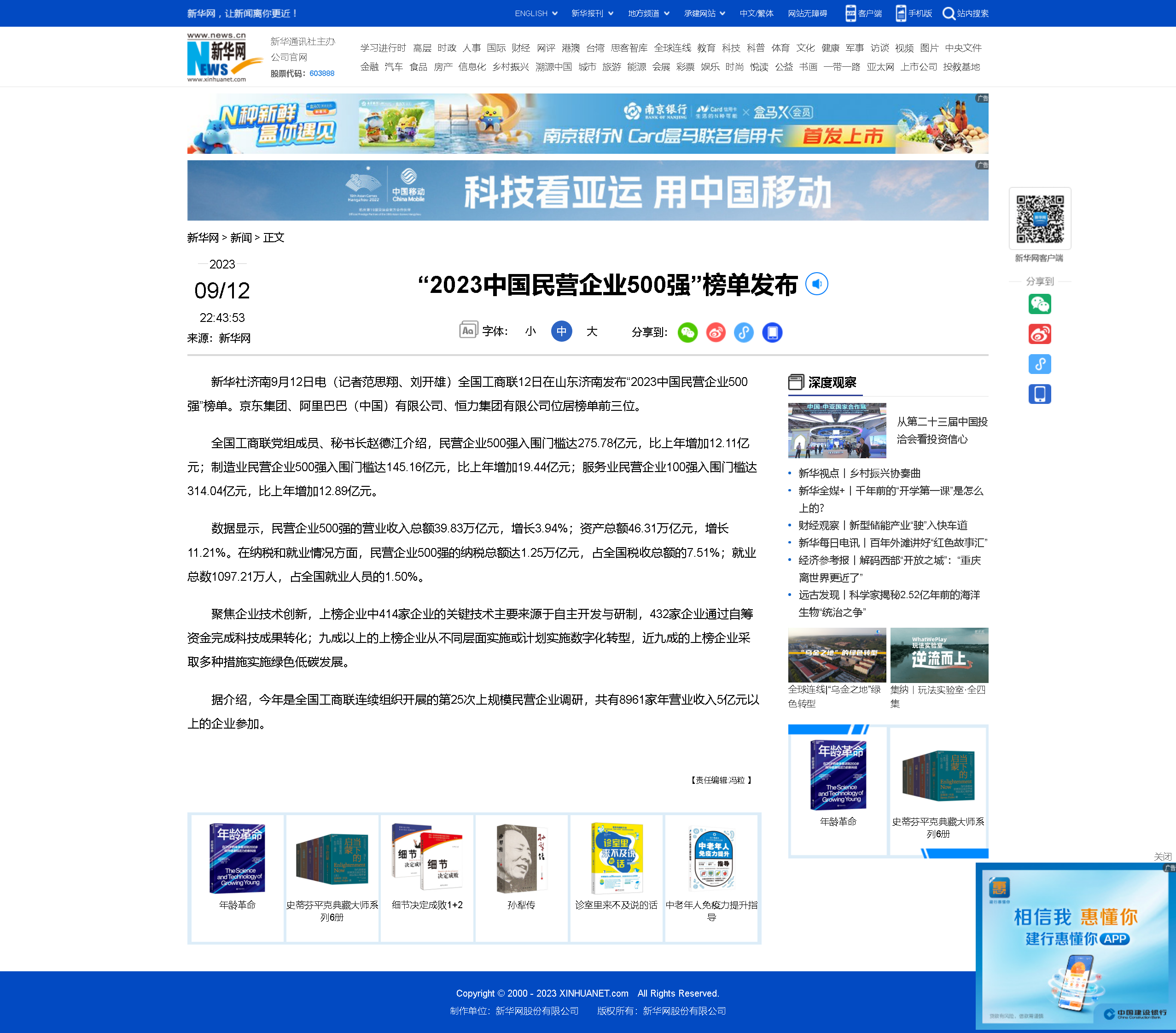 新華社濟南9月12日電(記者范思翔、劉開雄)全國工商聯(lián)12日在山東濟南發(fā)布“2023中國民營企業(yè)500強”榜單。京東集團、阿里巴巴(中國)有限公司、恒力集團有限公司位居榜單前三位。