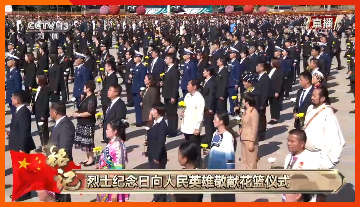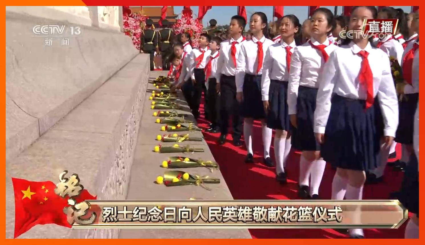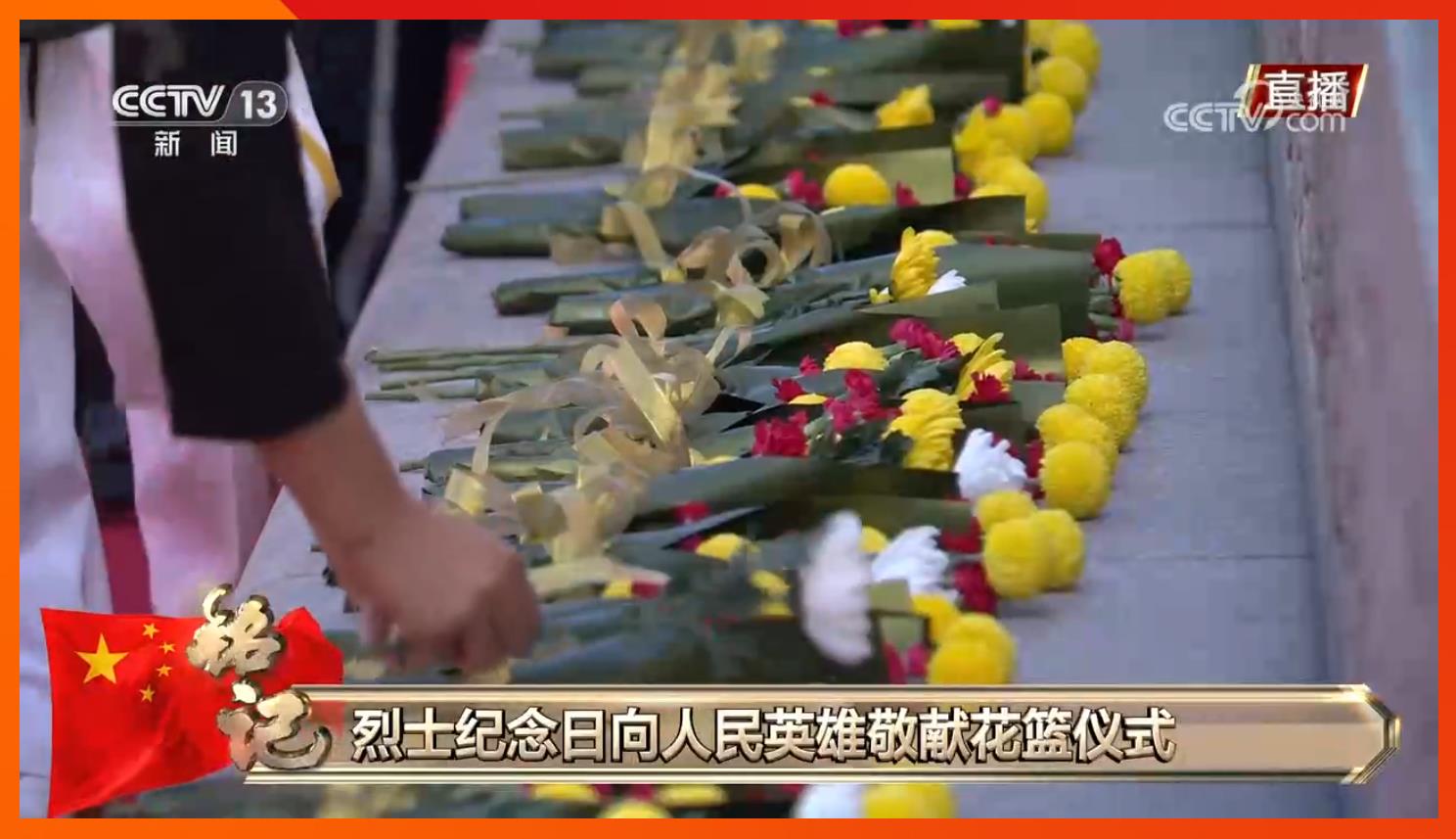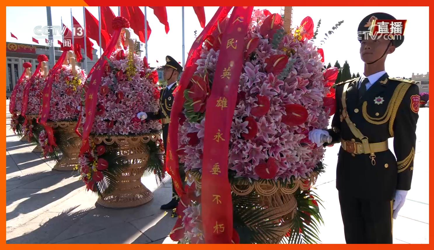 方陣前,以中共中央,全國(guó)人大常委會(huì),國(guó)務(wù)院,全國(guó)政協(xié),中央軍委,各民主黨派、全國(guó)工商聯(lián)和無(wú)黨派愛(ài)國(guó)人士,各人民團(tuán)體和各界群眾,老戰(zhàn)士、老同志和烈士親屬,中國(guó)少年先鋒隊(duì)名義敬獻(xiàn)的9個(gè)大型花籃一字排開(kāi),花籃紅色緞帶上書(shū)寫(xiě)的“人民英雄永垂不朽”格外醒目。