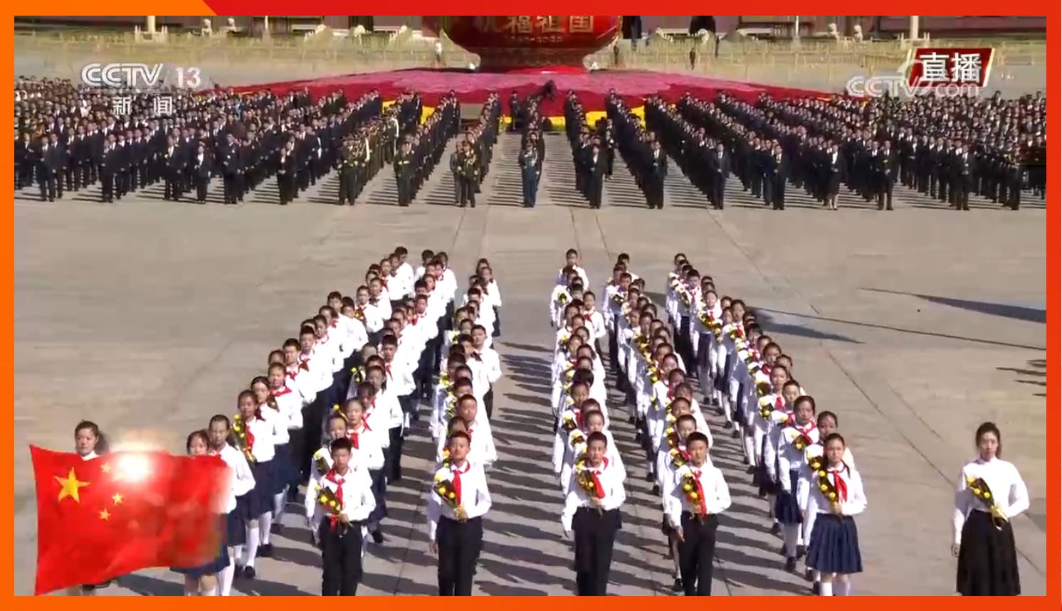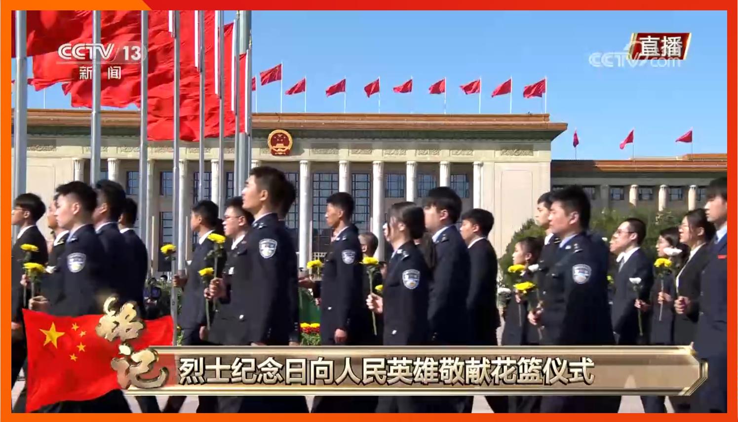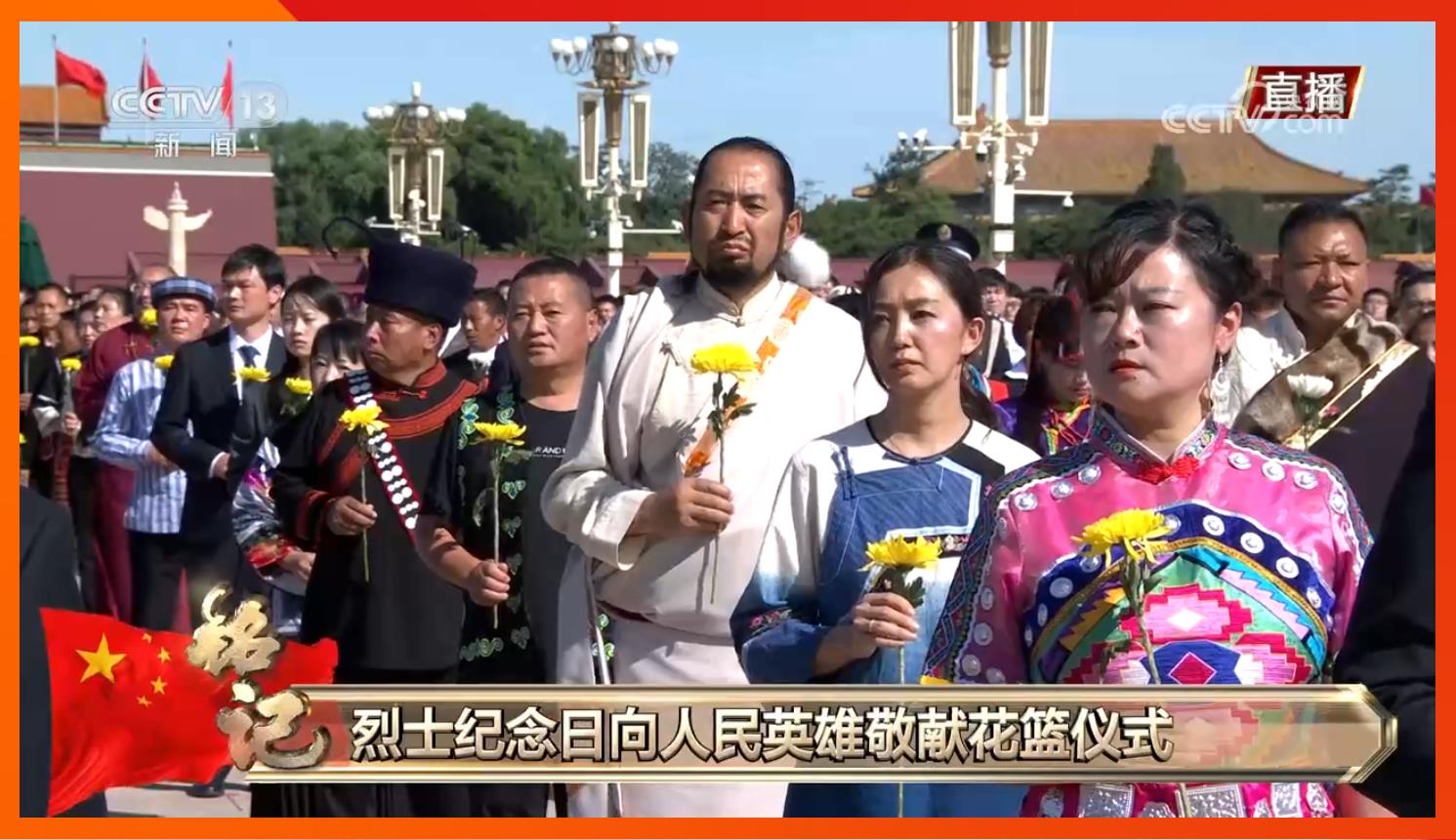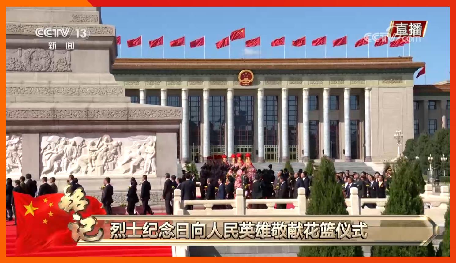方陣前,以中共中央,全國(guó)人大常委會(huì),國(guó)務(wù)院,全國(guó)政協(xié),中央軍委,各民主黨派、全國(guó)工商聯(lián)和無(wú)黨派愛(ài)國(guó)人士,各人民團(tuán)體和各界群眾,老戰(zhàn)士、老同志和烈士親屬,中國(guó)少年先鋒隊(duì)名義敬獻(xiàn)的9個(gè)大型花籃一字排開(kāi),花籃紅色緞帶上書(shū)寫(xiě)的“人民英雄永垂不朽”格外醒目。