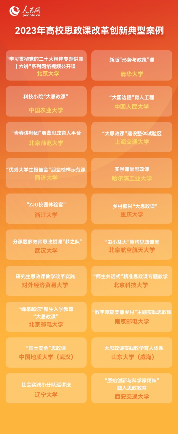 報告根據(jù)各高校思政課程的社會反響、信息傳播量、主流媒體關注度、輿論反饋情況等維度,在全國征集推介“北京大學‘學習貫徹黨的二十大精神專題講座十六講’系列網絡視頻公開課”“清華大學新版‘形勢與政策’課”“中國農業(yè)大學科技小院‘大思政課’”“中國人民大學‘大國邊疆’育人工程”“哈爾濱工業(yè)大學實景課堂思政課”等20個優(yōu)秀思政課程案例,以期為各高校思政課改革創(chuàng)新提供借鑒啟示。