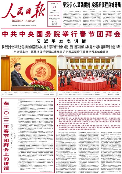 中共中央、國務院20日上午在人民大會堂舉行2023年春節(jié)團拜會。中共中央總書記、國家主席、中央軍委主席習近平發(fā)表講話,代表黨中央和國務院,向全國各族人民,向香港特別行政區(qū)同胞、澳門特別行政區(qū)同胞、臺灣同胞和海外僑胞拜年。春節(jié)前夕,習近平通過視頻連線看望慰問基層干部群眾,向全國各族人民致以新春的美好祝福,祝各族人民幸福安康,祝愿偉大祖國繁榮昌盛。