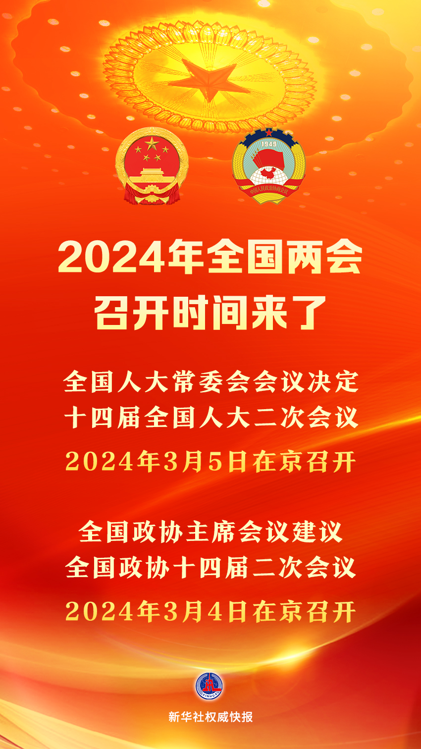 全國(guó)人大常委會(huì)會(huì)議12月29日表決通過(guò)了關(guān)于召開(kāi)十四屆全國(guó)人大二次會(huì)議的決定。根據(jù)決定,十四屆全國(guó)人大二次會(huì)議于2024年3月5日在北京召開(kāi)。政協(xié)第十四屆全國(guó)委員會(huì)日前召開(kāi)主席會(huì)議,建議全國(guó)政協(xié)十四屆二次會(huì)議于2024年3月4日在北京召開(kāi)。