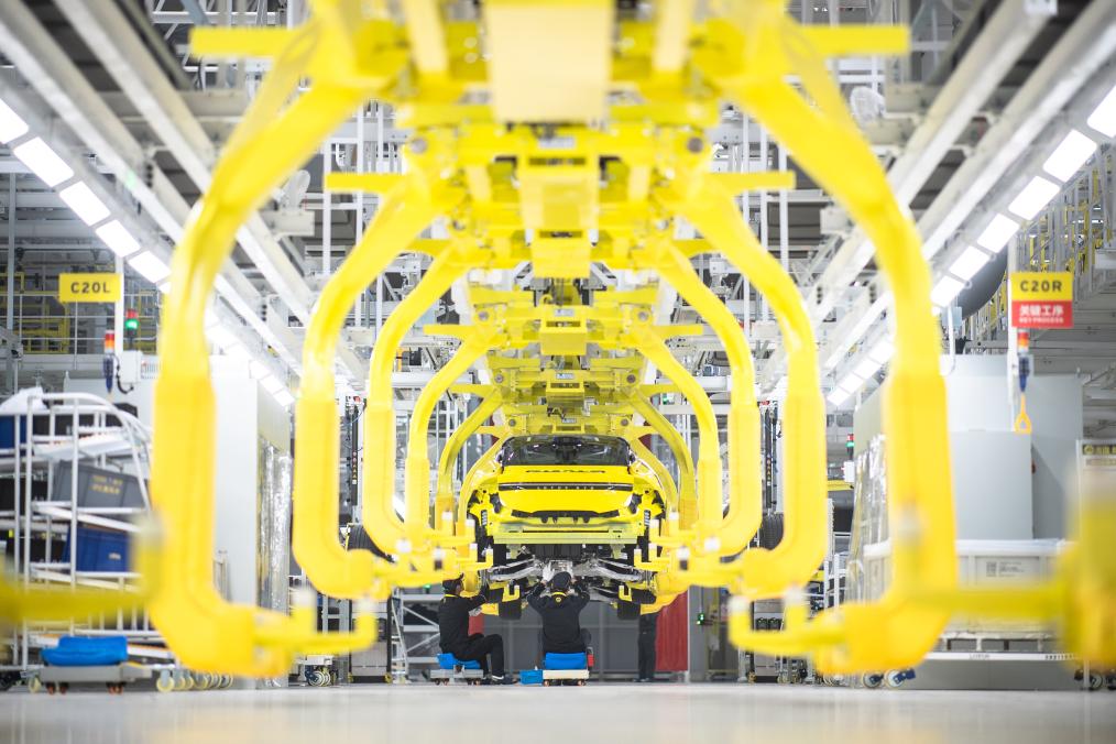 2023年1月11日,在位于湖北省武漢市經(jīng)開區(qū)智能網(wǎng)聯(lián)和電動(dòng)汽車產(chǎn)業(yè)園的路特斯全球智能工廠,工人在流水線上作業(yè)。新華社記者肖藝九攝