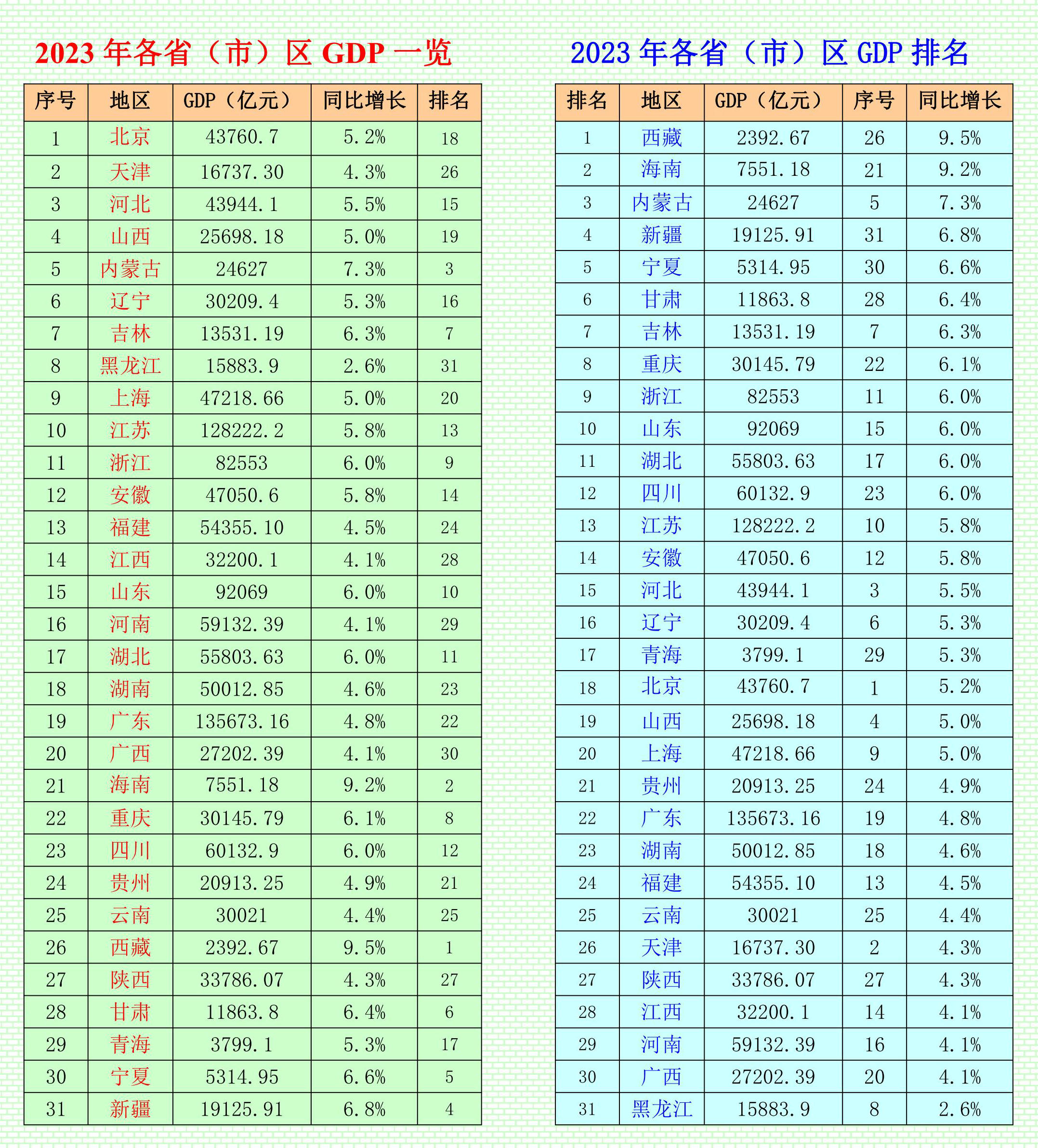 從同比增速看,過半數(shù)?。▍^(qū)、市)GDP增速跑贏“全國線”。西藏以9.5%的增速領(lǐng)跑全國,增速較上年提高8.3個百分點。海南緊隨其后,增長9.2%。內(nèi)蒙古同比增長7.3%,新疆、寧夏、甘肅、吉林、重慶分別增長6.8%、6.6%、6.4%、6.3%和6.1%。山東、四川、浙江、湖北均增長6.0%,江蘇、安徽均增長5.8%,河北為5.5%,遼寧、青海均增長5.3%。北京增速與全國持平,山西、上海、貴州、廣東、湖南、福建、云南、天津、陜西、廣西、江西、河南、黑龍江低于全國增速水平。