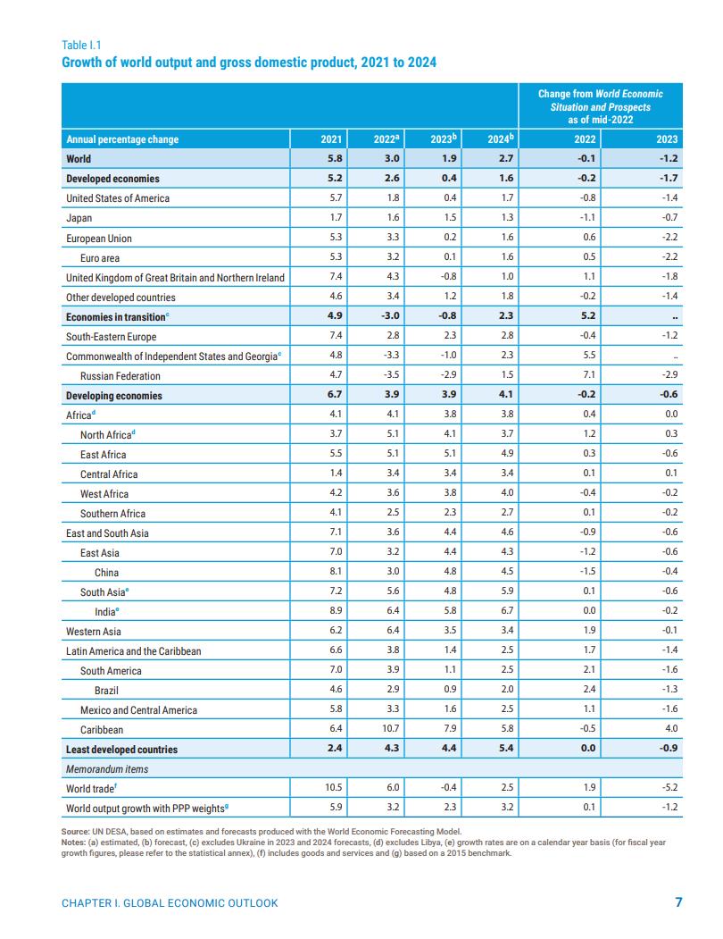 報(bào)告說,在新冠疫情、烏克蘭危機(jī)、高通貨膨脹和氣候變化等影響下,2022年世界經(jīng)濟(jì)遭受重創(chuàng),2023年世界經(jīng)濟(jì)繼續(xù)承壓。如果一些宏觀經(jīng)濟(jì)逆風(fēng)能夠開始消退,世界經(jīng)濟(jì)增長將在2024年回升至2.7%。