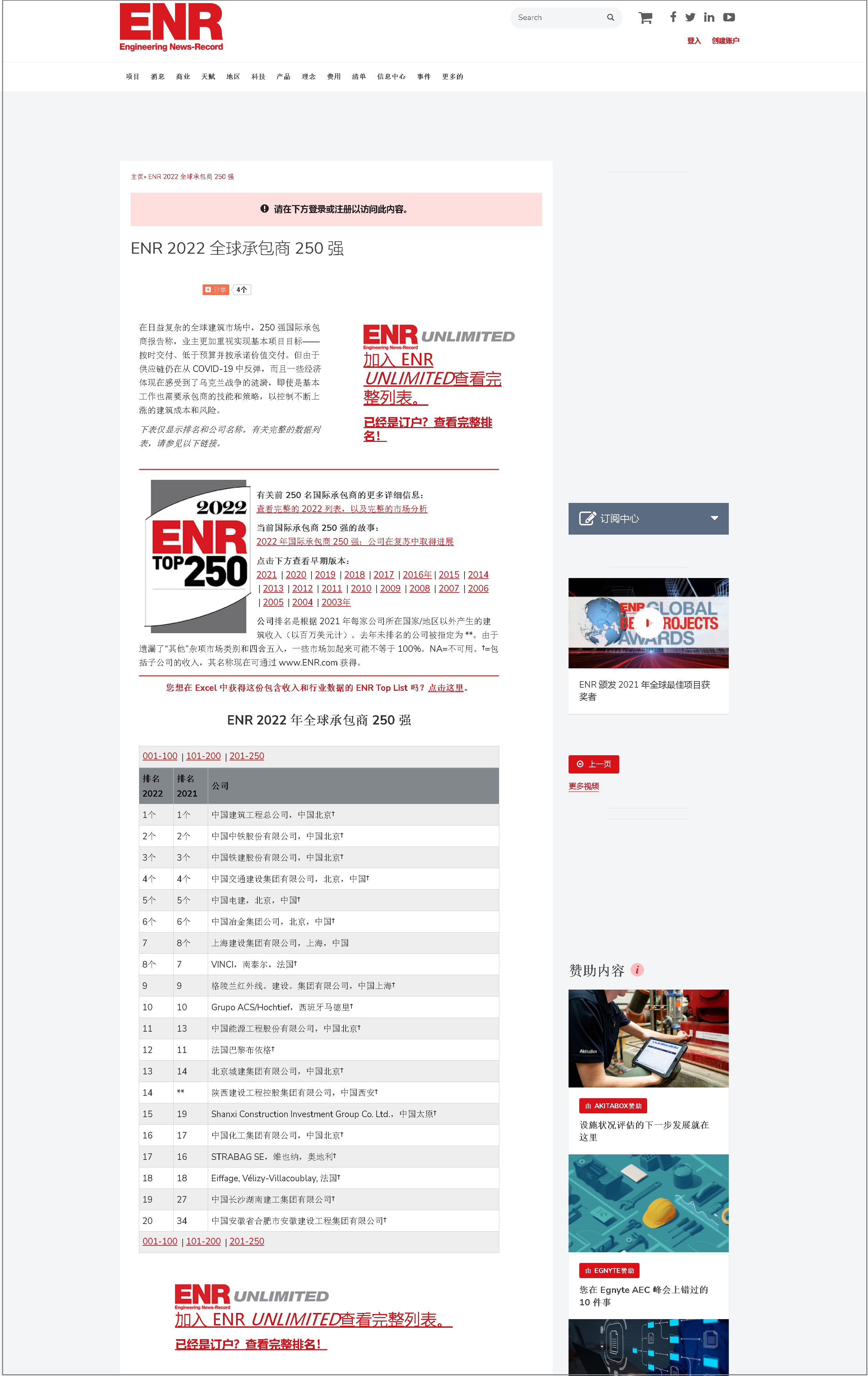 《工程新聞紀(jì)錄》,簡(jiǎn)稱ENR,是一份美國(guó)的周刊,該刊物主要關(guān)注建筑工程領(lǐng)域,致力提供全球性的工程新聞、評(píng)論意見、分析數(shù)據(jù)等,ENR創(chuàng)刊于1874年,《工程新聞紀(jì)錄》(英文:The Engineering News-Record),由麥格勞·希爾集團(tuán)控股。ENR每年固定出版美國(guó)及全球工程領(lǐng)域相關(guān)公司的規(guī)模排名,其中尤以世界承包商225強(qiáng)(ENR Global 225)、國(guó)際承包商225強(qiáng)(ENR International 225)兩項(xiàng)排名為全球業(yè)內(nèi)人士熟知,擁有較高權(quán)威性和知名度。