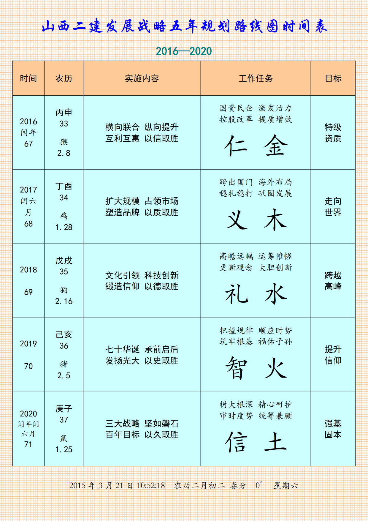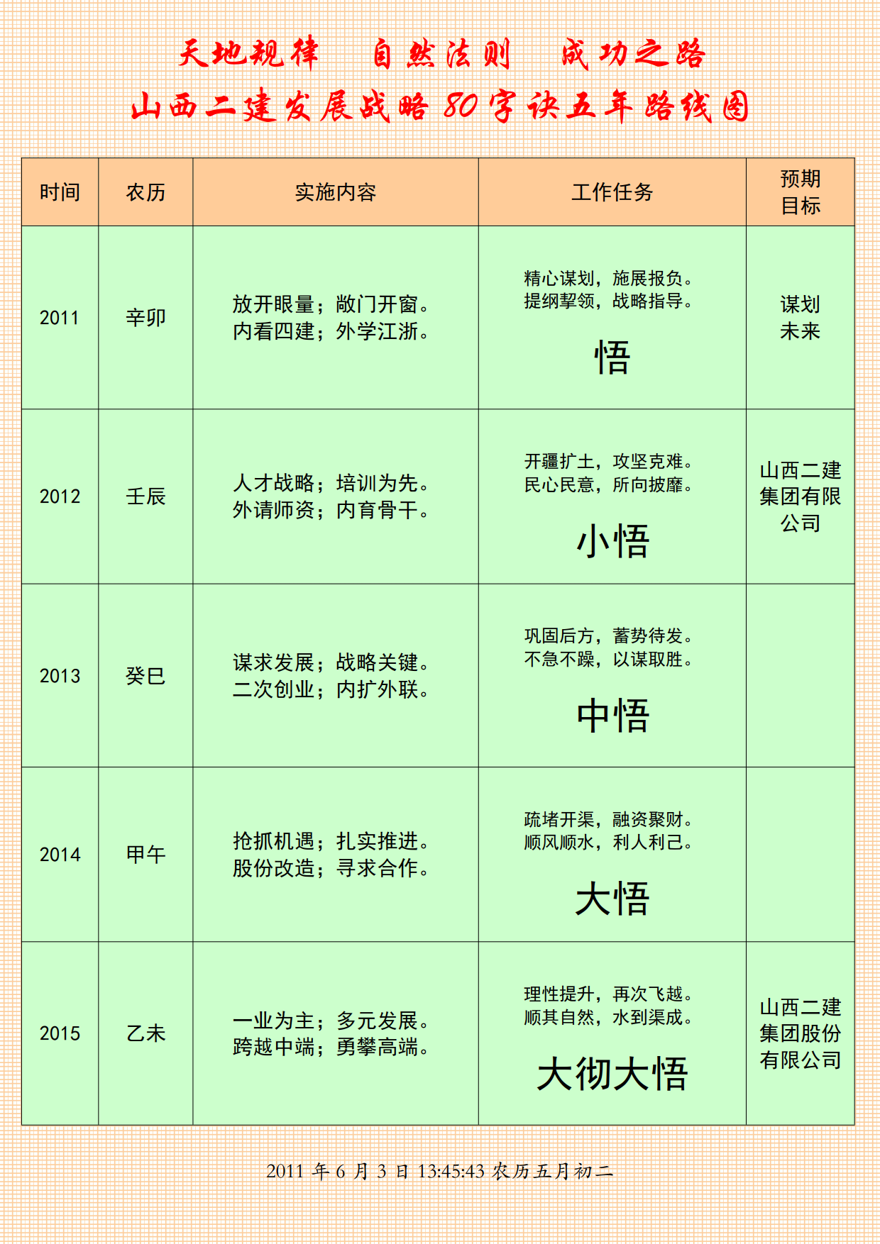 2011年在省建協(xié)的時候,某一天我的小靈通突然連續(xù)響了起來,拿出來看,顯示13個1。起初,我以為是觸碰造成的,并不在意。但是,無論怎么操作,甚至取出電池,一直消除不掉。第二天下午,與二建總經理會晤,說起此事,專門讓他看。他說,這倒奇怪了,沒有遇到過這樣的事情。再按退出鍵,13個1不見了。那么,十三個一要告訴我什么呢,是一三年需要幫助比我小十三歲的人,需要三個十年成就他的事業(yè)。第一個十年,在磕磕碰碰中走過來了;現在第二個十年開始了,這個十年是最關鍵的十年;第三個十年才能達到一流企業(yè)的戰(zhàn)略目標。