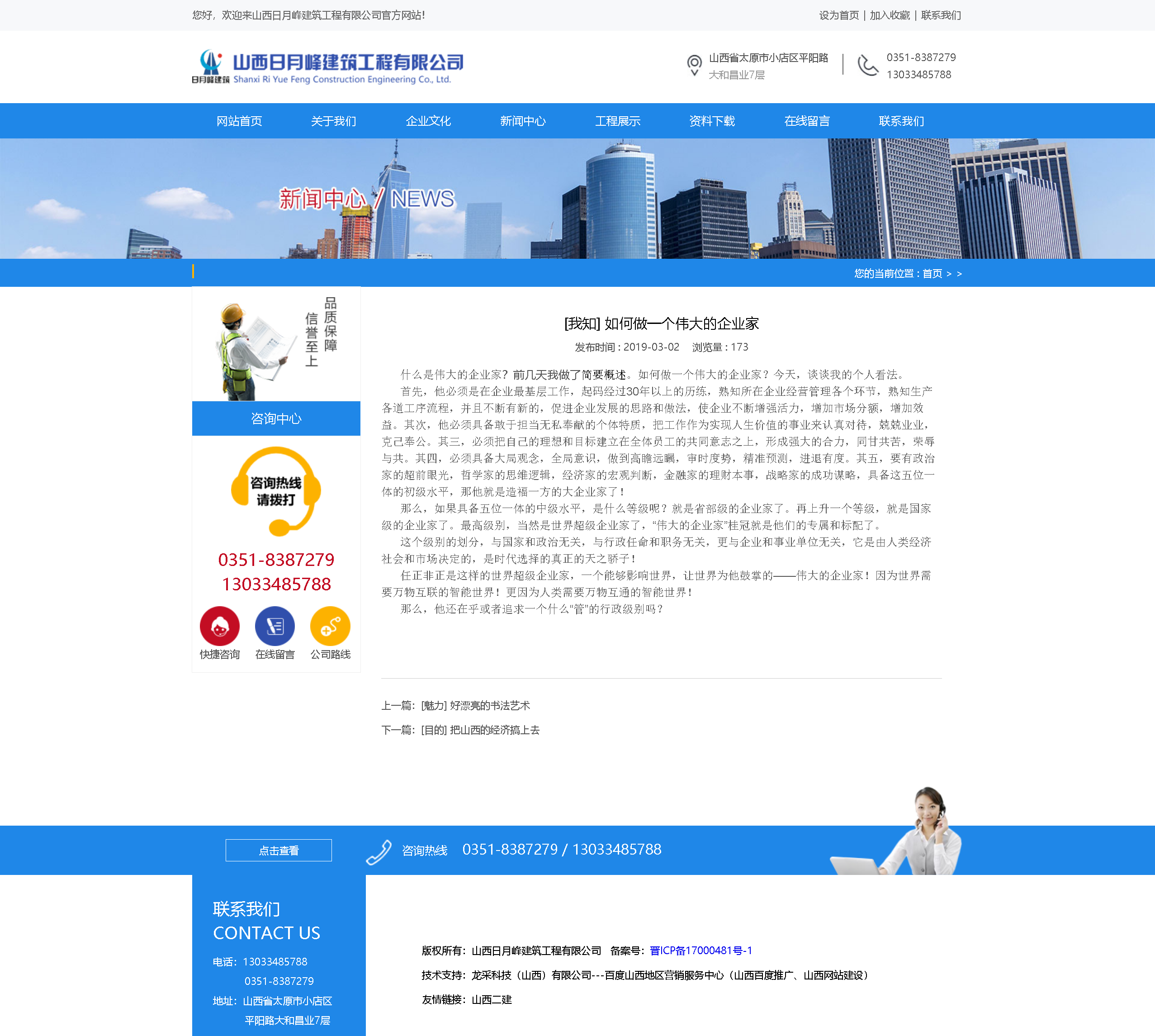 作為建筑企業(yè),把建造人類美好幸福的家園,作為實(shí)現(xiàn)企業(yè)做大做強(qiáng)的發(fā)展戰(zhàn)略,需要科技領(lǐng)先,技術(shù)先進(jìn),理念超前,服務(wù)周到,一流的質(zhì)量,一流的信譽(yù),一流的觀念!