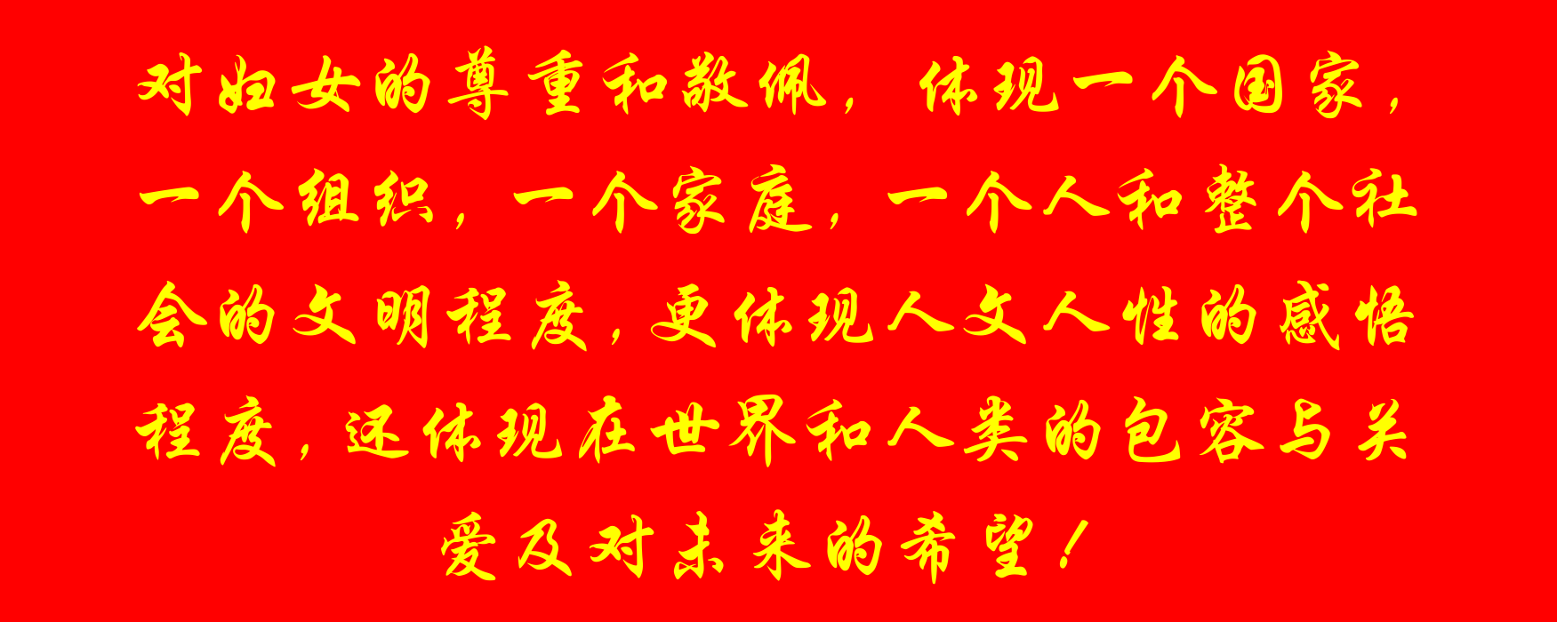 對婦女的尊重和敬佩,體現(xiàn)一個國家,一個組織,一個家庭,一個人和整個社會的文明程度,更體現(xiàn)人文人性的感悟程度,還體現(xiàn)在世界和人類的包容與關(guān)愛及對未來的希望!