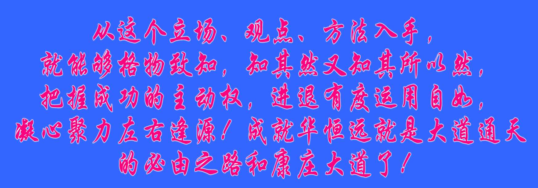 從這個(gè)立場、觀點(diǎn)、方法入手,就能夠格物致知,知其然又知其所以然,把握成功的主動(dòng)權(quán),進(jìn)退有度運(yùn)用自如,凝心聚力左右逢源!成就華恒遠(yuǎn)就是大道通天的必由之路和康莊大道了!