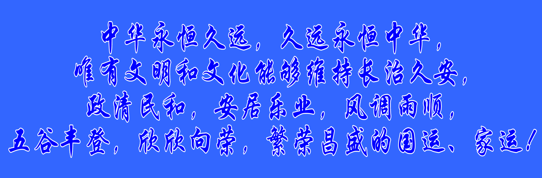 中華永恒久遠(yuǎn),久遠(yuǎn)永恒中華,唯有文明和文化能夠維持長(zhǎng)治久安,政清民和,安居樂業(yè),風(fēng)調(diào)雨順,五谷豐登,欣欣向榮,繁榮昌盛的國(guó)運(yùn)、家運(yùn)!