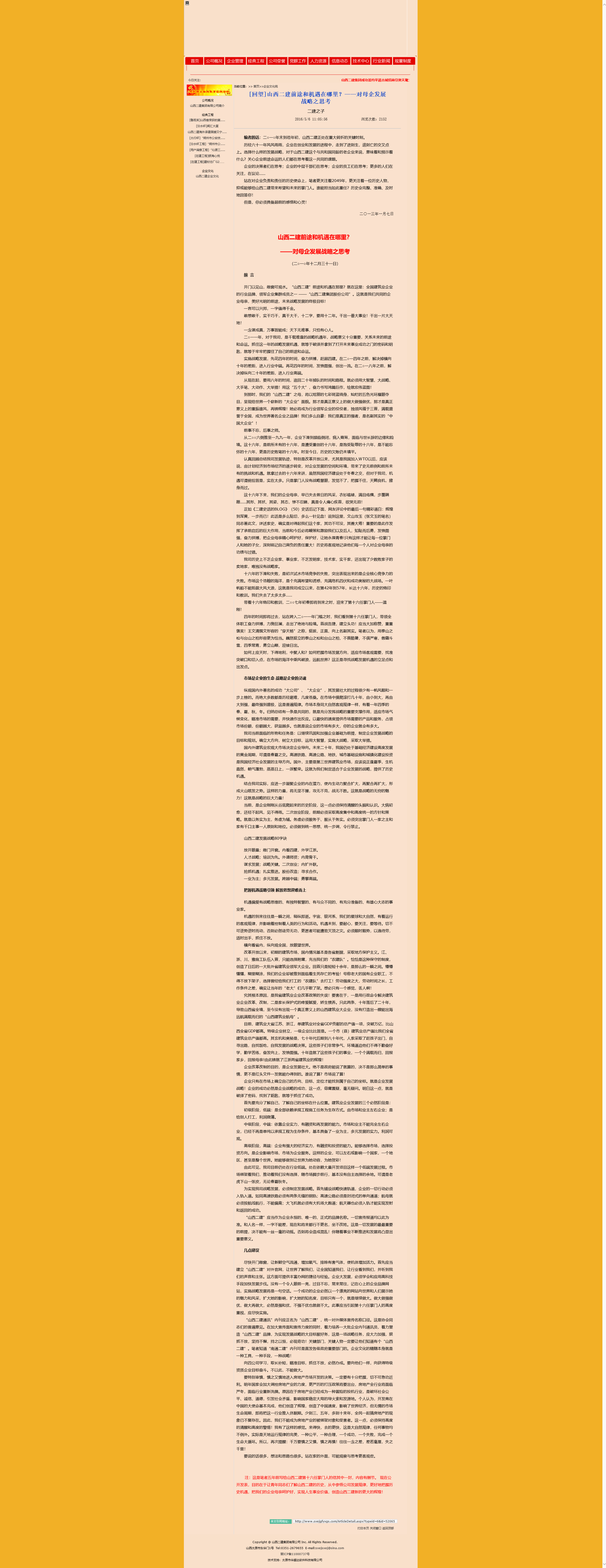 注:這是筆者五年前寫(xiě)給山西二建第十六任掌門(mén)人的信其中一封,內(nèi)容有刪節(jié)。 現(xiàn)在公開(kāi)發(fā)表,目的在于讓青年同志們了解山西二建的歷史,從中參悟公司發(fā)展規(guī)律,更好地把握歷史機(jī)遇,把我們的企業(yè)母親呵護(hù)好,實(shí)現(xiàn)人生事業(yè)價(jià)值,創(chuàng)造山西二建新的更大的輝煌!