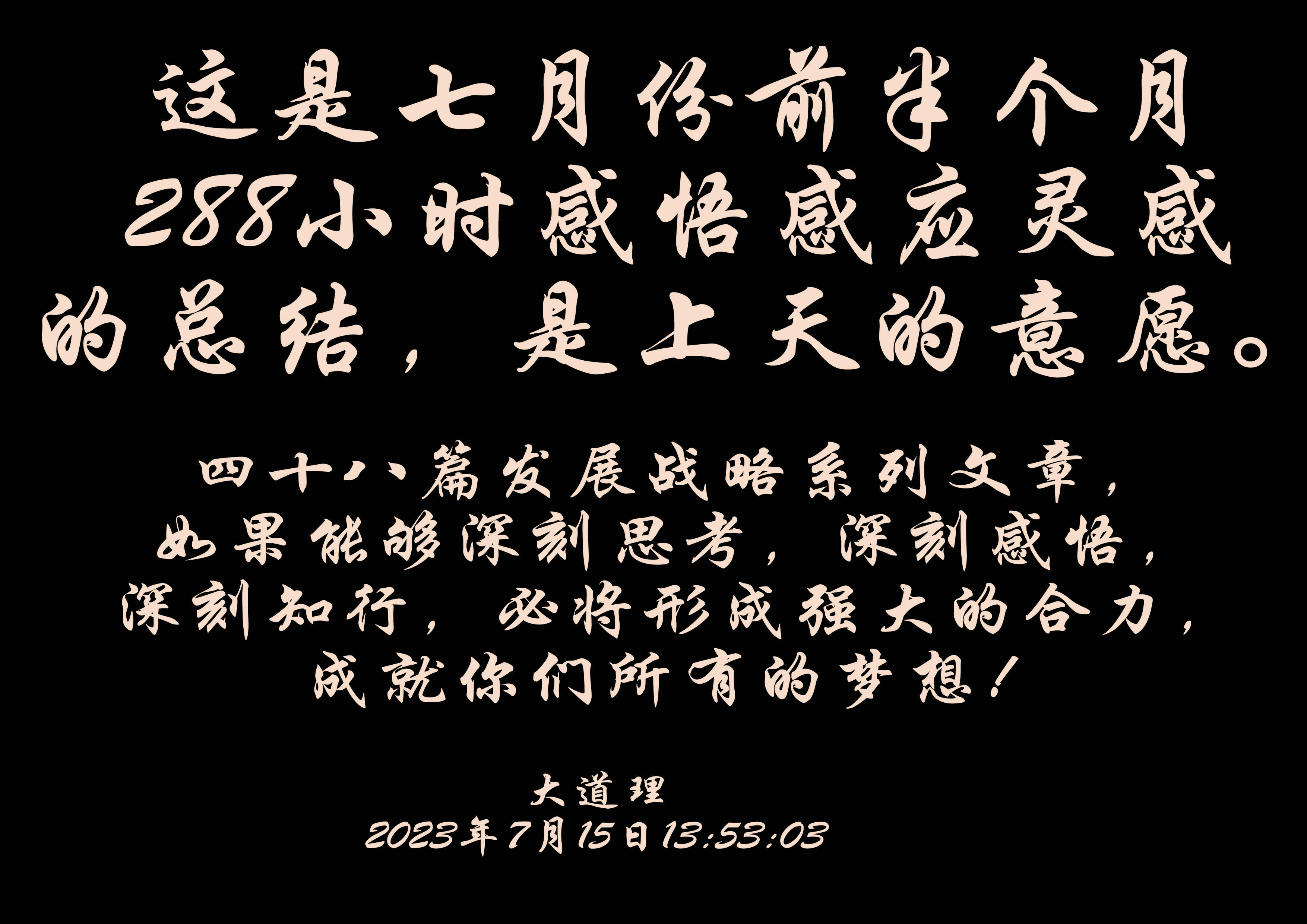 這是七月份前半個月288小時感悟感應(yīng)靈感的總結(jié),是上天的意愿。四十八篇發(fā)展戰(zhàn)略系列文章,如果能夠深刻思考,深刻感悟,深刻知行,必將形成強(qiáng)大的合力,成就你們所有的夢想!