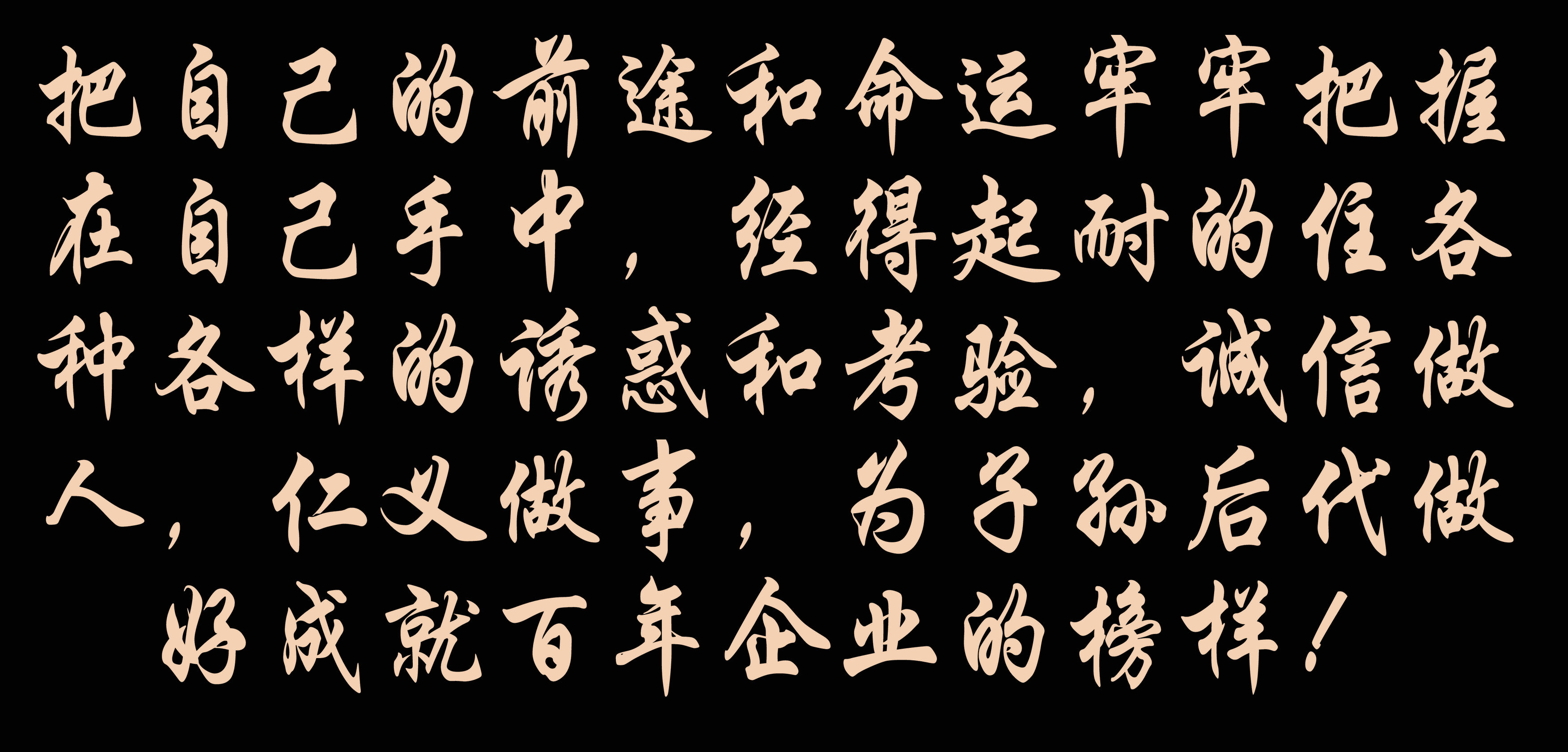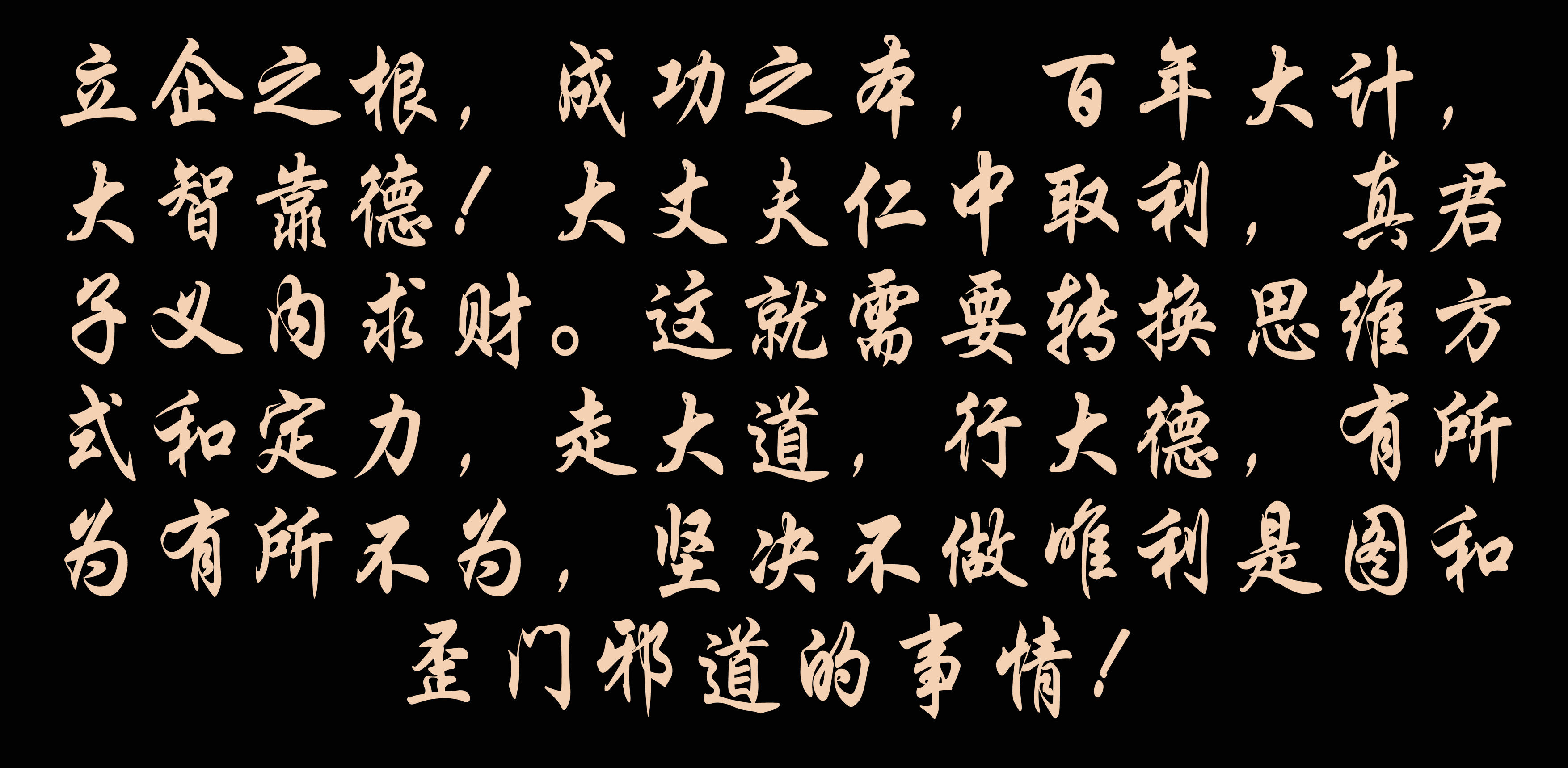 立企之根,成功之本,百年大計,大智靠德!大丈夫仁中取利,真君子義內(nèi)求財。這就需要轉(zhuǎn)換思維方式和定力,走大道,行大德,有所為有所不為,堅決不做唯利是圖和歪門邪道的事情,把自己的前途和命運牢牢把握在自己手中,經(jīng)得起耐的住各種各樣的誘惑和考驗,誠信做人,仁義做事,為子孫后代做好成就百年企業(yè)的榜樣!