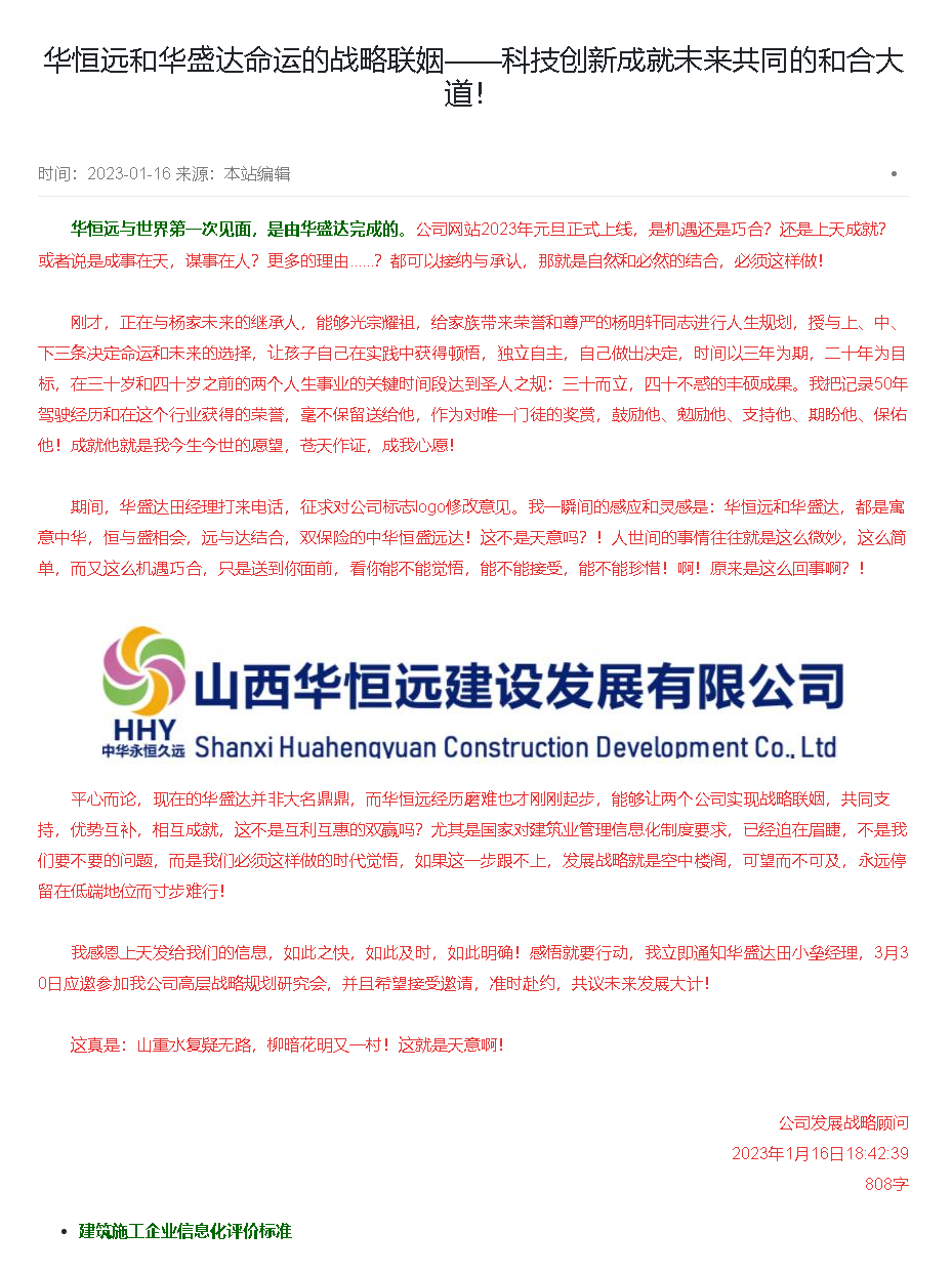 華恒遠(yuǎn)與世界第一次見面,是由華盛達(dá)完成的。公司網(wǎng)站2023年元旦正式上線,是機(jī)遇還是巧合?還是上天成就?或者說是成事在天,謀事在人?更多的理由......?都可以接納與承認(rèn),那就是自然和必然的結(jié)合,必須這樣做!