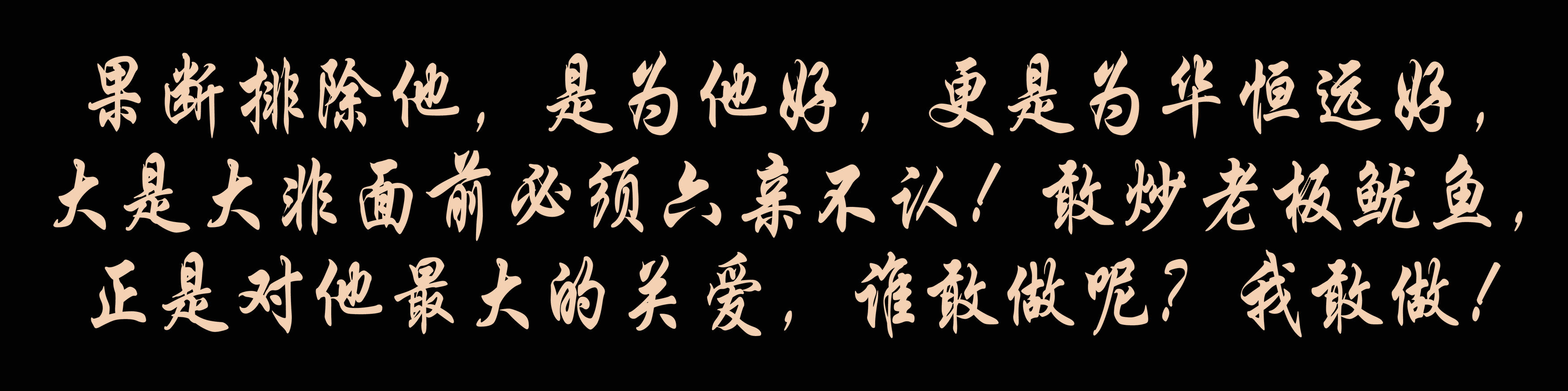 機(jī)遇的到來,就是一瞬之間,稍縱即逝,大事一定要當(dāng)真,不可含含糊糊!千萬不敢像我批評的那個人一樣,糊里糊涂,自以為是,栽了多少跟頭都不長一點(diǎn)記性!果斷排除他,是為他好,更是為華恒遠(yuǎn)好,大是大非面前必須六親不認(rèn)!敢炒老板魷魚,正是對他最大的關(guān)愛,誰敢做呢?我敢做!