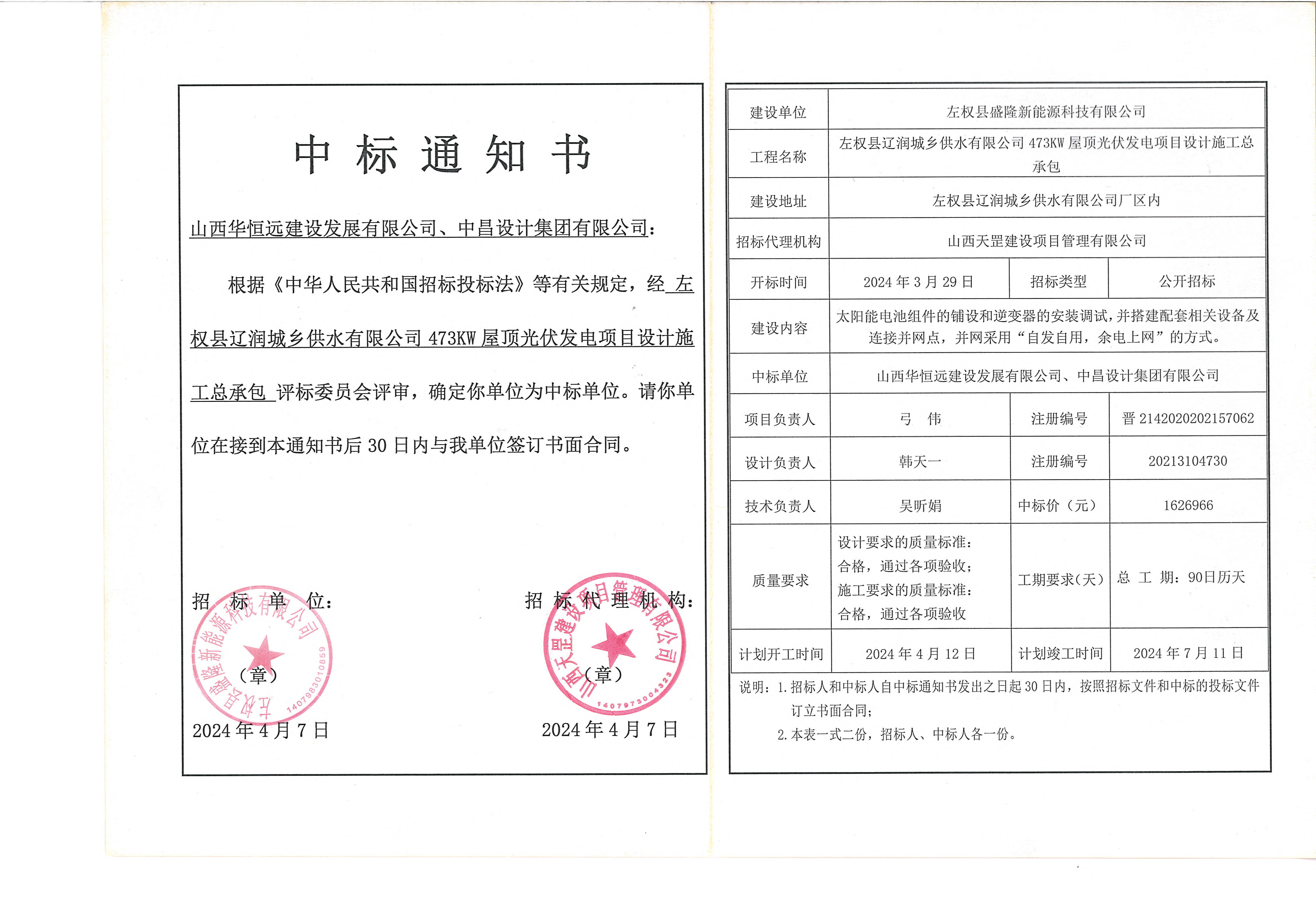 左權(quán)縣遼闊城鄉(xiāng)供水有限公司473KW屋頂光伏發(fā)電項目設(shè)計施工總承包合同