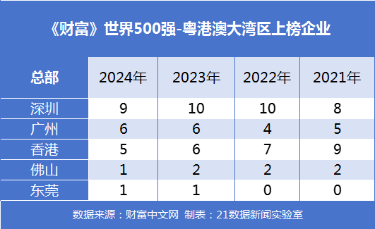 從地域上看,此次上榜的大灣區(qū)公司中,總部集中在“五座萬億城”,深圳有9家公司上榜,數(shù)量位居大灣區(qū)第一;其次為廣州,有6家上榜,香港有5家公司上榜,佛山、東莞分別有1家公司位列世界500強。