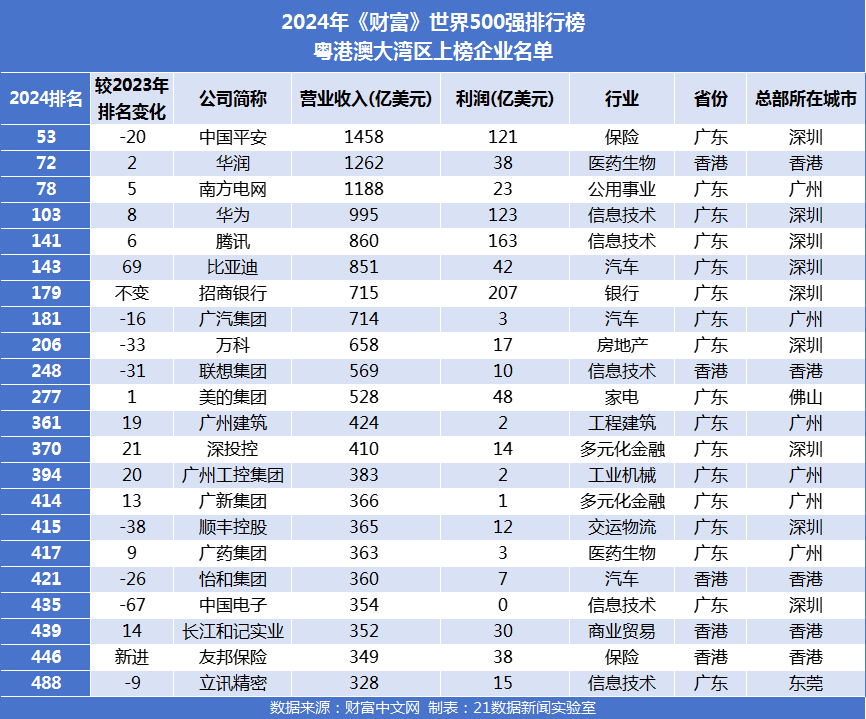 據(jù)21數(shù)據(jù)新聞實驗室統(tǒng)計,粵港澳大灣區(qū)共有22家公司入圍世界500強,2023年營收總額約為1.39萬億美元,利潤總額為919億美元。