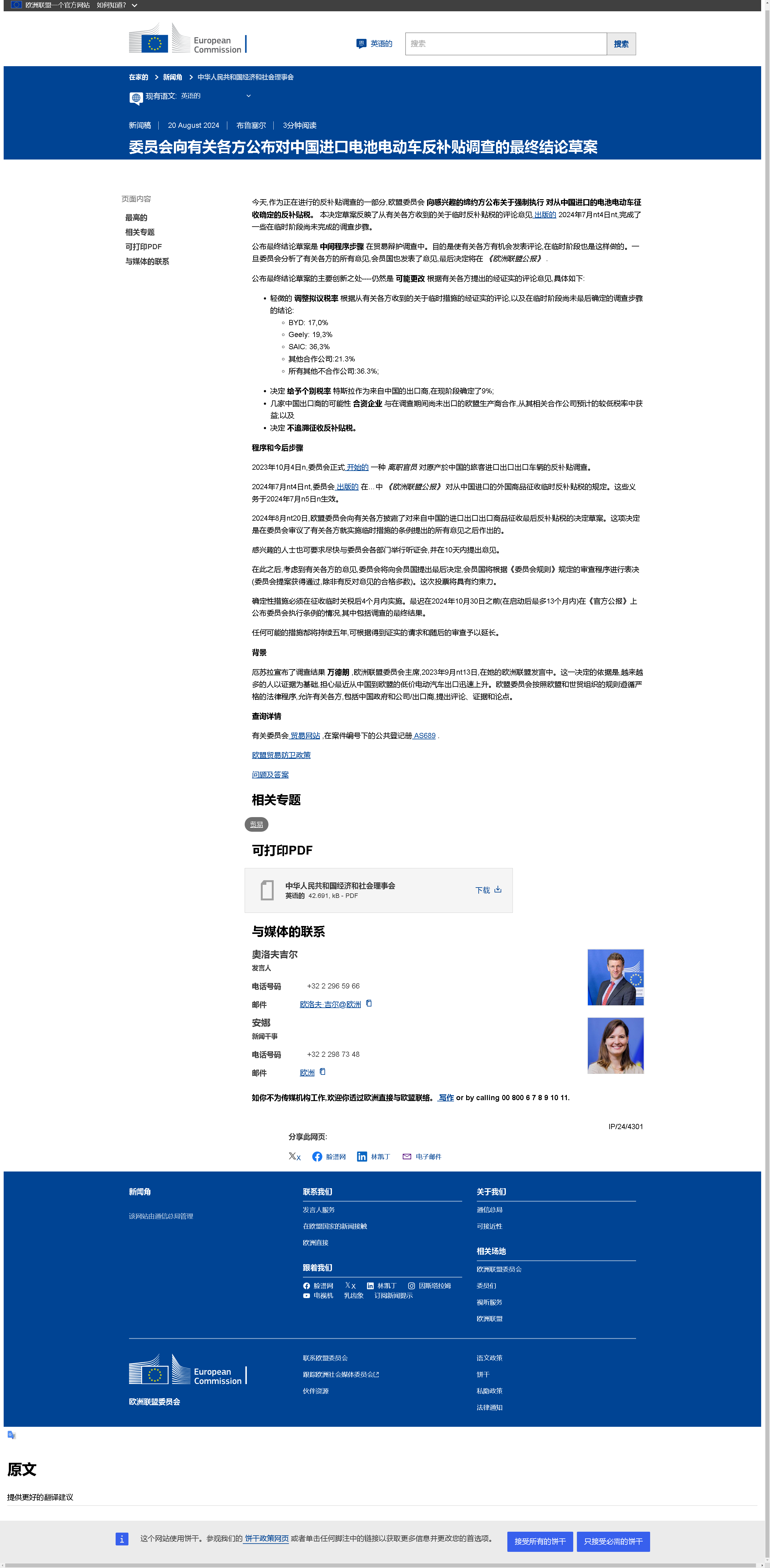 據(jù)央視新聞消息,當(dāng)?shù)貢r(shí)間8月20日 ,歐盟委員會(huì)(下稱“歐委會(huì)”)向相關(guān)方披露了對(duì)從中國(guó)進(jìn)口的純電動(dòng)汽車征收最終反補(bǔ)貼稅的決定草案。