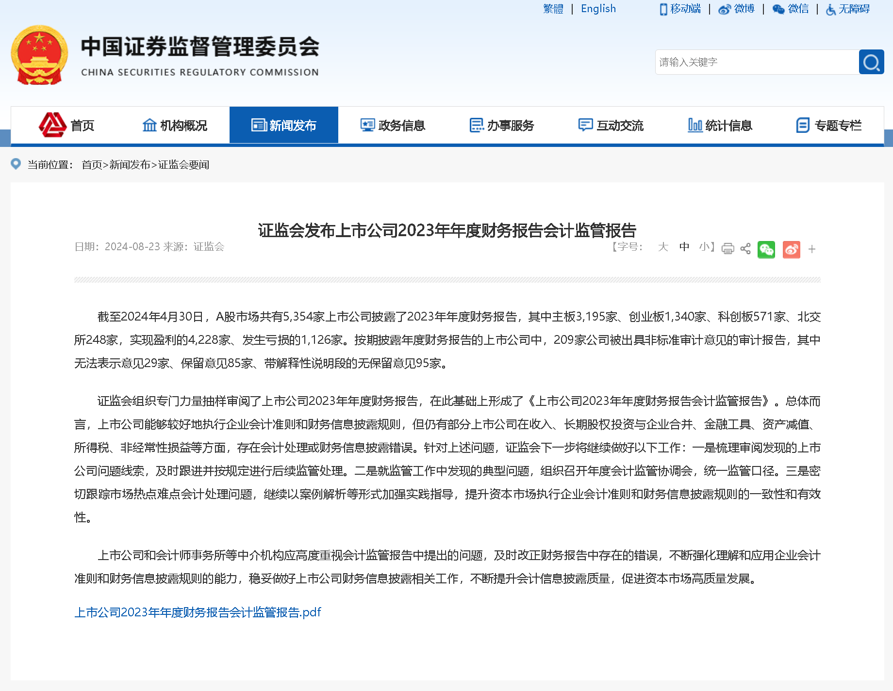 證監(jiān)會發(fā)布上市公司2023年年度財(cái)務(wù)報(bào)告會計(jì)監(jiān)管報(bào)告