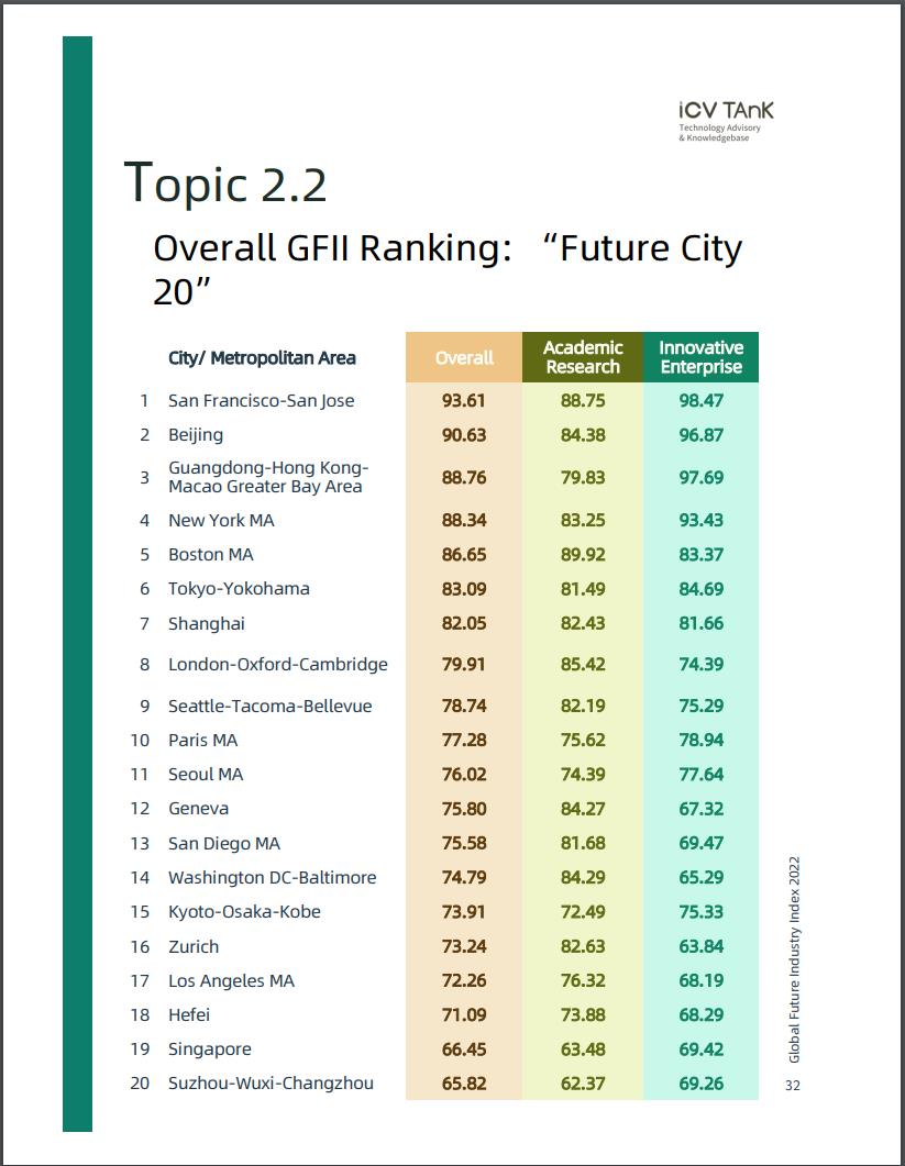 全球著名的科技咨詢機構(gòu)iCV TAnK日前發(fā)布《2022全球未來產(chǎn)業(yè)發(fā)展指數(shù)》,對全球未來產(chǎn)業(yè)進行了全面、系統(tǒng)排名。其中,北京在“未來之城”綜合排名中居全球第二,在科研設(shè)施指標上排名第一。