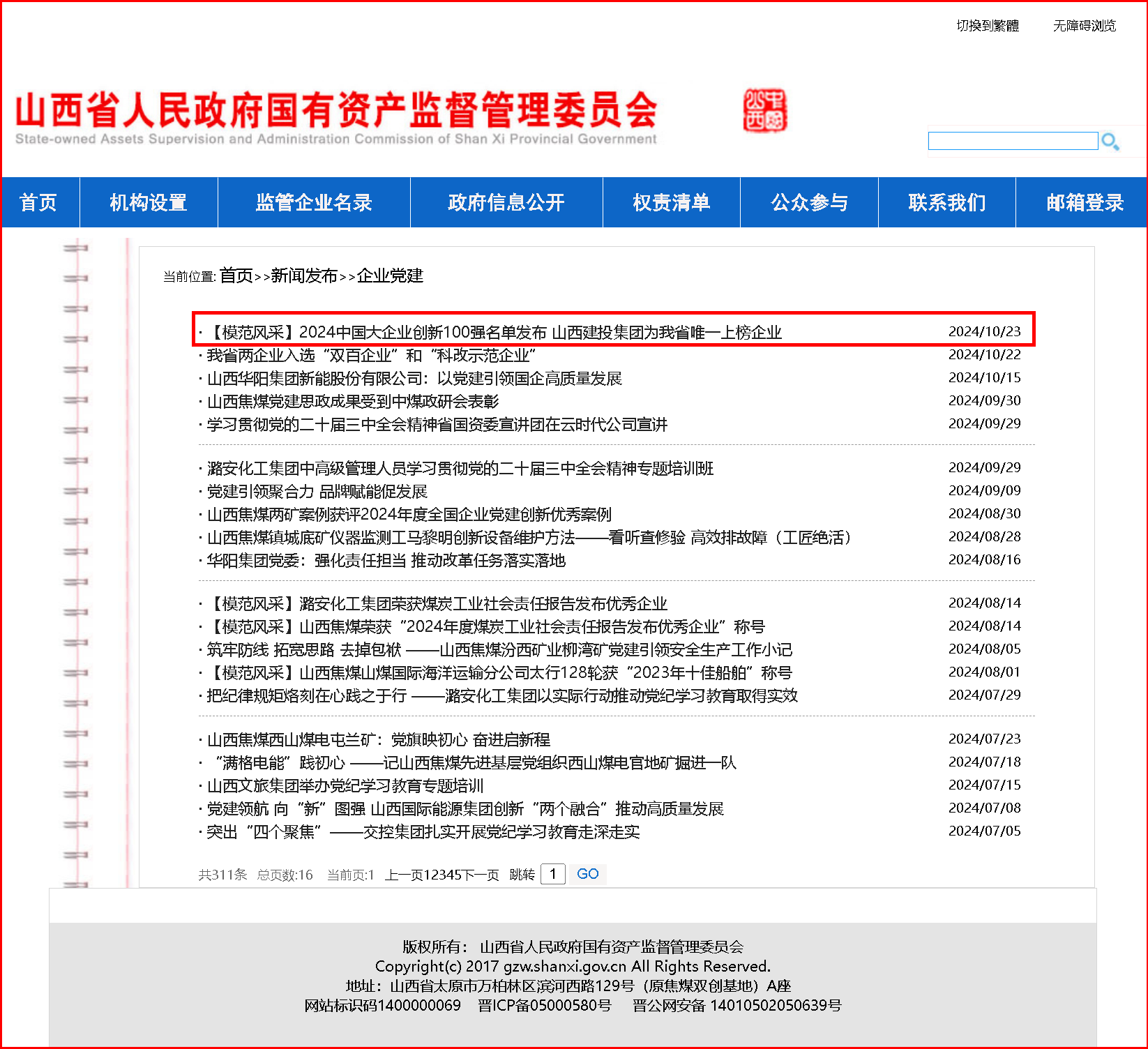 1 【模范風(fēng)采】2024中國大企業(yè)創(chuàng)新100強(qiáng)名單發(fā)布山西建投集團(tuán)為我省唯一上榜企業(yè) 2024/10/23
