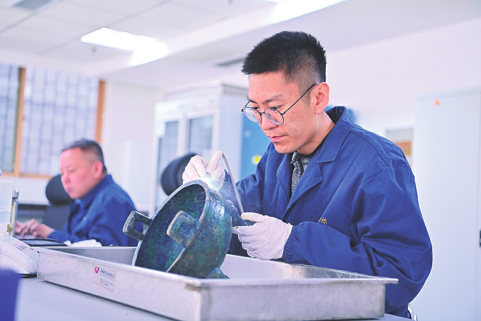 在山西博物院文物保護(hù)研究部青銅修復(fù)室,張政敏(右)為青銅器進(jìn)行超聲波除銹。新華社記者楊晨光攝