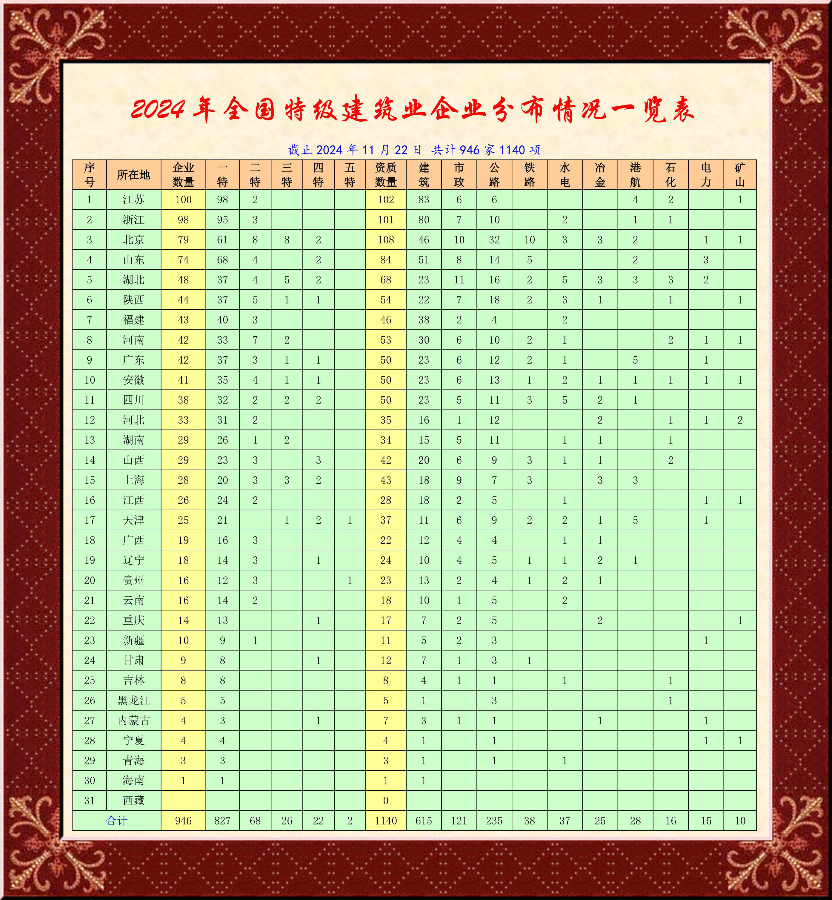 根據(jù)《中華人民共和國建筑法》及有關(guān)建設(shè)工程企業(yè)資質(zhì)管理規(guī)定,現(xiàn)將我部核準(zhǔn)的工程勘察資質(zhì)、工程設(shè)計資質(zhì)、建筑業(yè)企業(yè)資質(zhì)、工程監(jiān)理企業(yè)資質(zhì)的單位名單(2024年度第十一批)予以公布。未予核準(zhǔn)的單位可登錄住房城鄉(xiāng)建設(shè)部政務(wù)服務(wù)門戶,點擊“申請事項辦理進度查詢(受理發(fā)證信息查詢)”欄目查詢原因。