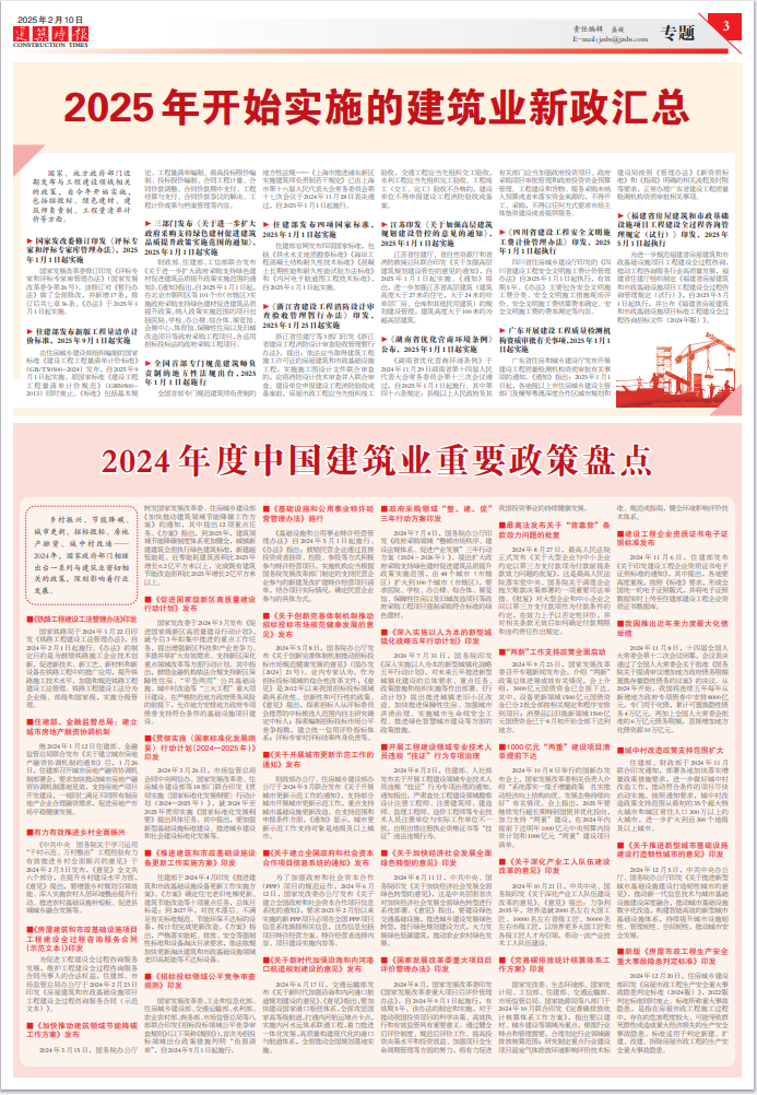 鄉(xiāng)村振興、節(jié)能降碳、城市更新、招標投標、房地產(chǎn)融資、城中村改造……2024年,國家政府部門相繼出臺一系列與建筑業(yè)密切相關(guān)的政策,深刻影響著行業(yè)發(fā)展。