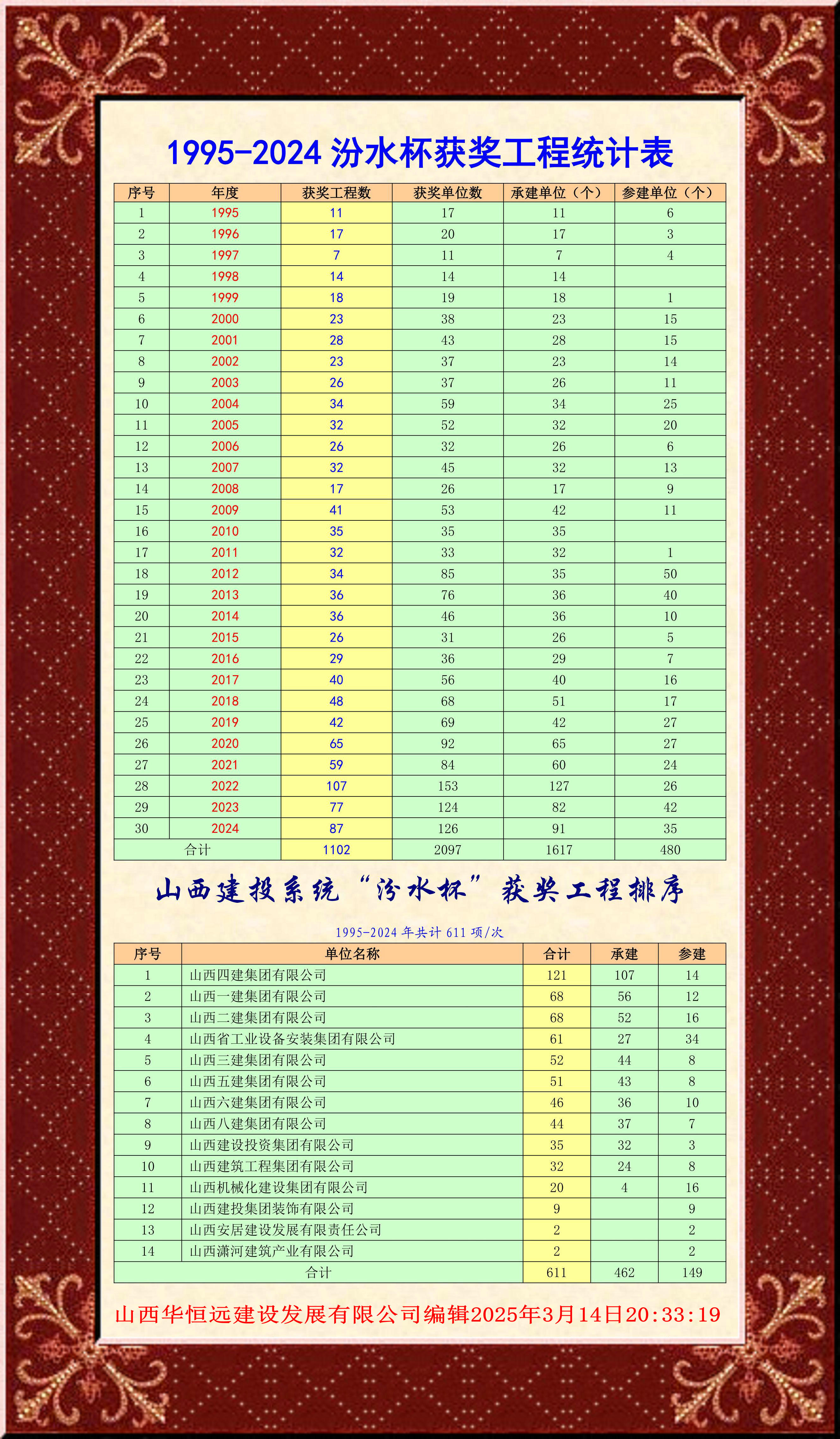 根據(jù)《山西省人民政府辦公廳關(guān)于促進(jìn)建筑業(yè)持續(xù)健康發(fā)展的實(shí)施意見》(晉政辦發(fā)〔2017〕135號)文件中提出的“汾水杯”工作要求和《山西省建筑業(yè)協(xié)會汾水杯工程評價(jià)辦法(2021年修訂)》文件精神,經(jīng)會員單位自愿申報(bào),省屬各建設(shè)行業(yè)協(xié)會、各市建筑業(yè)協(xié)會和有關(guān)大型企業(yè)集團(tuán)擇優(yōu)推薦,山西省建筑業(yè)協(xié)會組織業(yè)內(nèi)專家嚴(yán)格貫徹執(zhí)行國家有關(guān)法律、法規(guī)和工程建設(shè)強(qiáng)制性標(biāo)準(zhǔn),堅(jiān)持以工程質(zhì)量為核心,以工程建設(shè)強(qiáng)制性標(biāo)準(zhǔn)為準(zhǔn)繩,公平、公正、公開的開展了評價(jià)活動(dòng)。