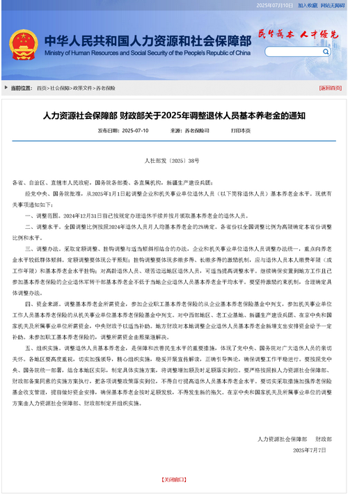 日前,人力資源社會保障部、財政部印發(fā)《關(guān)于2025年調(diào)整退休人員基本養(yǎng)老金的通知》。具體如何調(diào)整,一起來了解一下。
