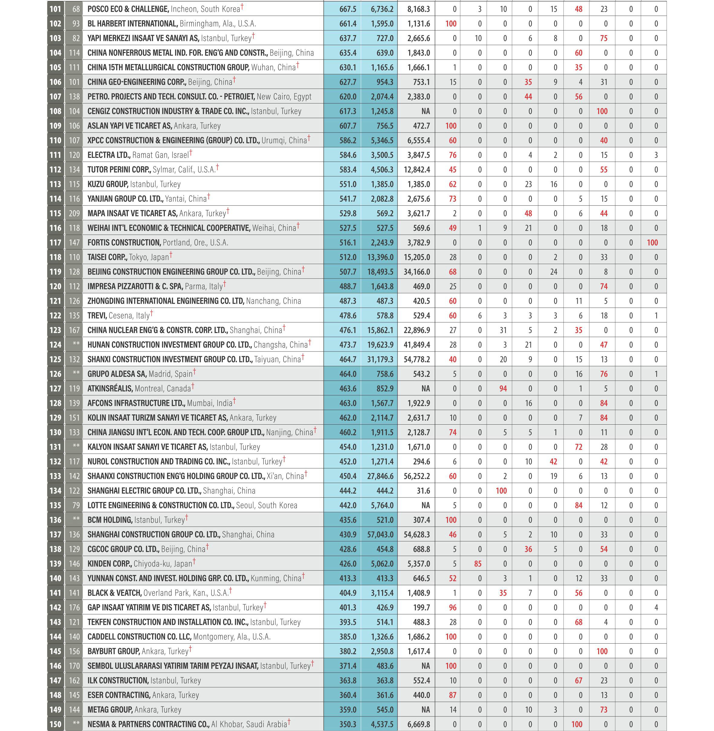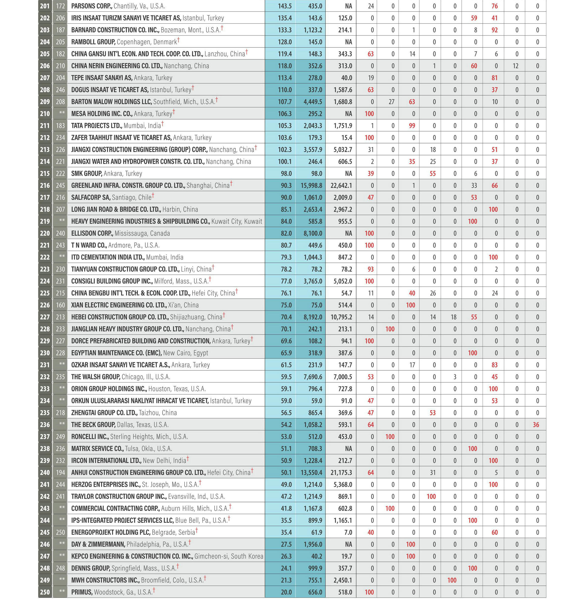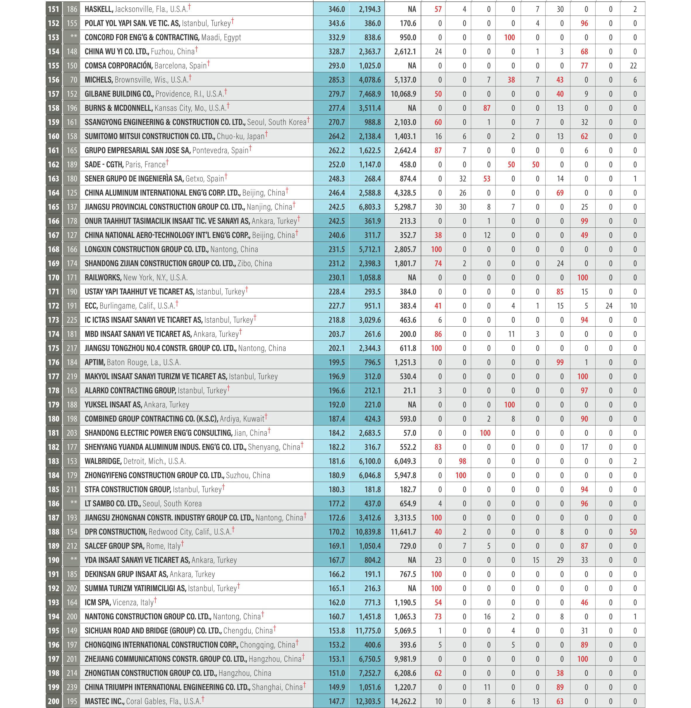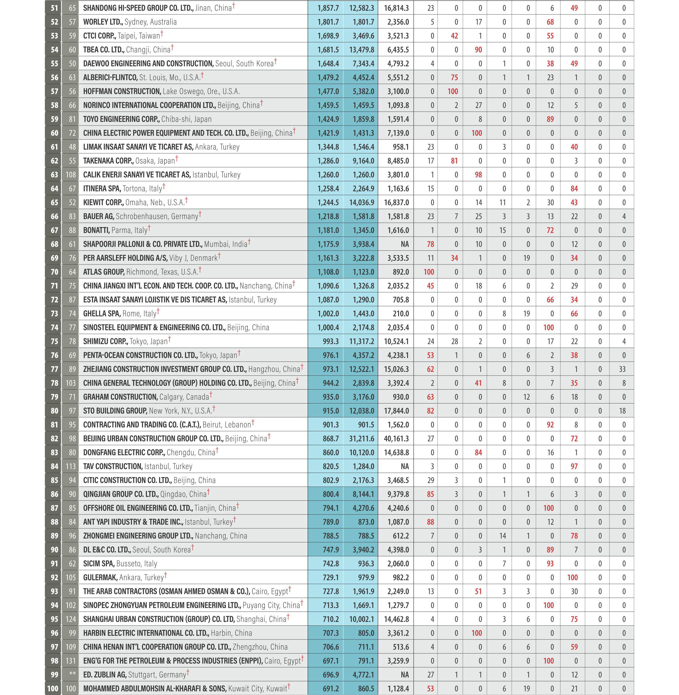 在ENR同期發(fā)布的“最大250家全球承包商”榜單中(以國內(nèi)與國際營業(yè)額合計排序),共7家中國企業(yè)進入前10強,與上年度持平,其中中國建筑、中國中鐵、中國鐵建、中國交建包攬前4位,中國電建排名第6位、中冶科工排名第7位、上海建工排名第8位。此外,中國能建、北京城建、山西建投、中國化學工程、陜西建工、湖南建投、北京建工、綠地大基建、中國核建、安徽建工、特變電工、中油工程、山東高速、浙江建投、四川路橋、東方電氣、上海城建等企業(yè)進入榜單前50強,體現(xiàn)了中國企業(yè)在全球基建行業(yè)的重要地位。