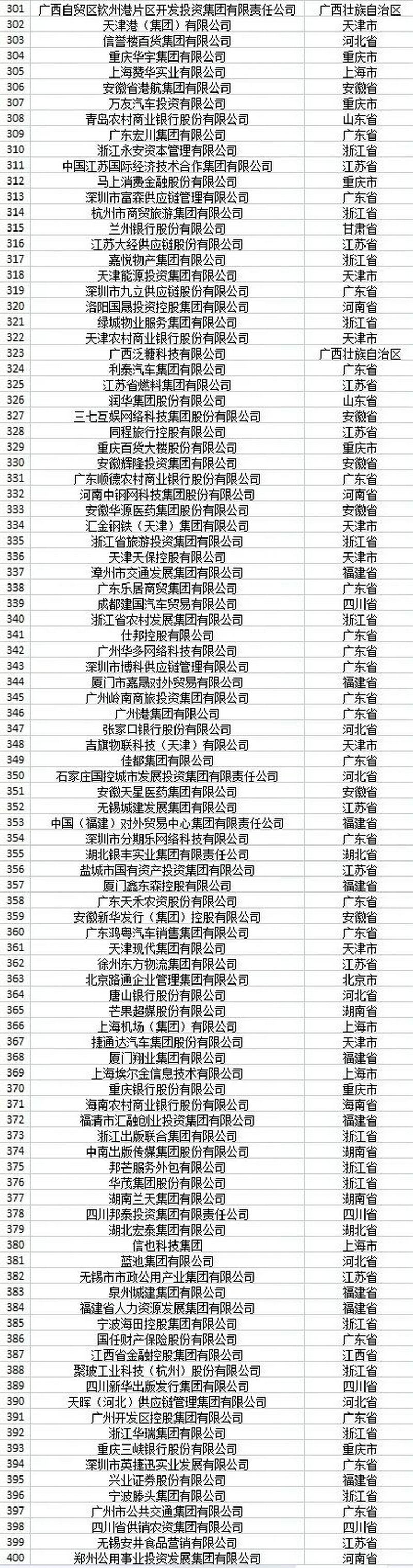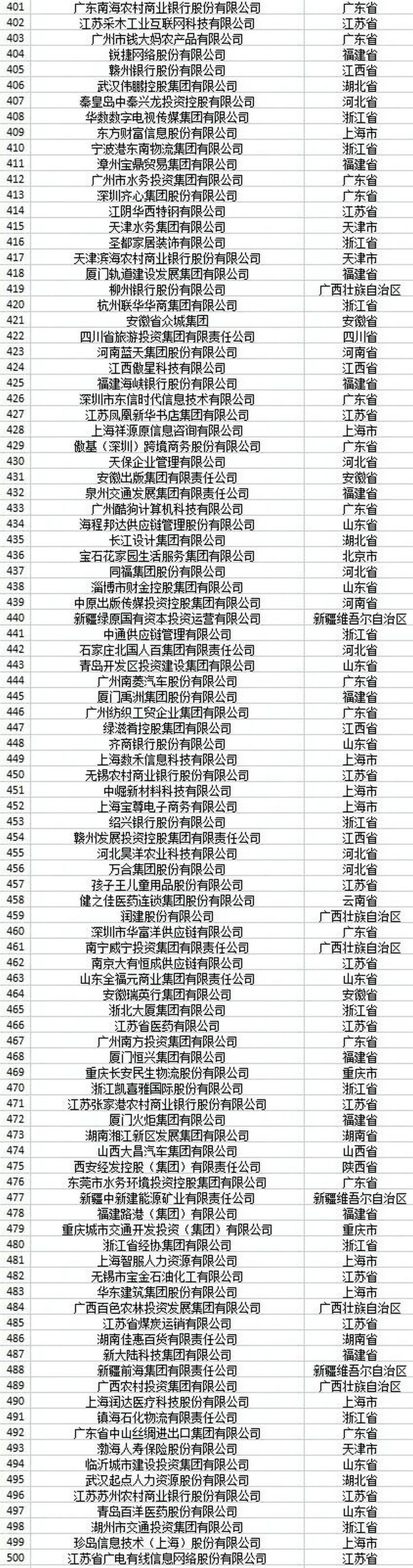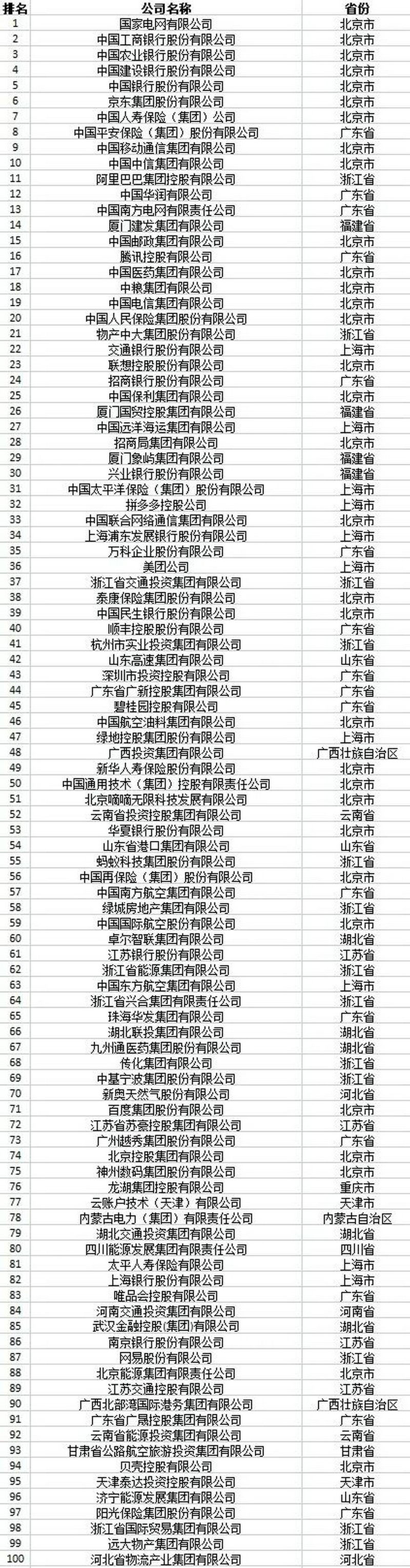 位列榜單前10位的企業(yè)分別是:國(guó)家電網(wǎng)有限公司、中國(guó)工商銀行股份有限公司、中國(guó)農(nóng)業(yè)銀行股份有限公司、中國(guó)建設(shè)銀行股份有限公司、中國(guó)銀行股份有限公司、京東集團(tuán)股份有限公司、中國(guó)人壽保險(xiǎn)(集團(tuán))公司、中國(guó)平安保險(xiǎn)(集團(tuán))股份有限公司、中國(guó)移動(dòng)通信集團(tuán)有限公司和中國(guó)中信集團(tuán)有限公司。