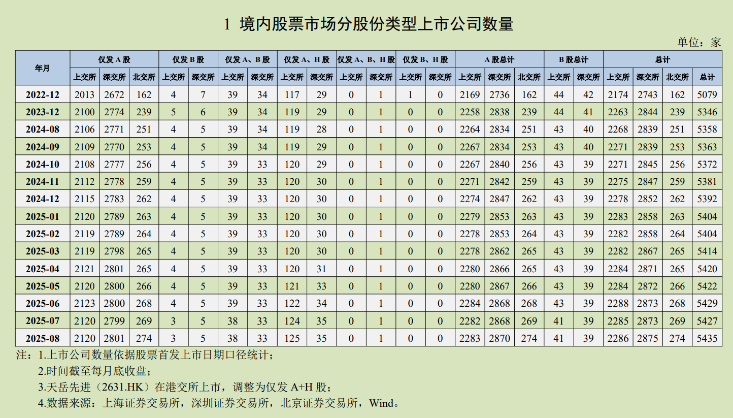 中國上市公司協(xié)會最新發(fā)布的數(shù)據(jù)顯示,截至2025年8月31日,境內股票市場共有上市公司5435家,滬、深、北證券交易所分別為2286、2875、274家。