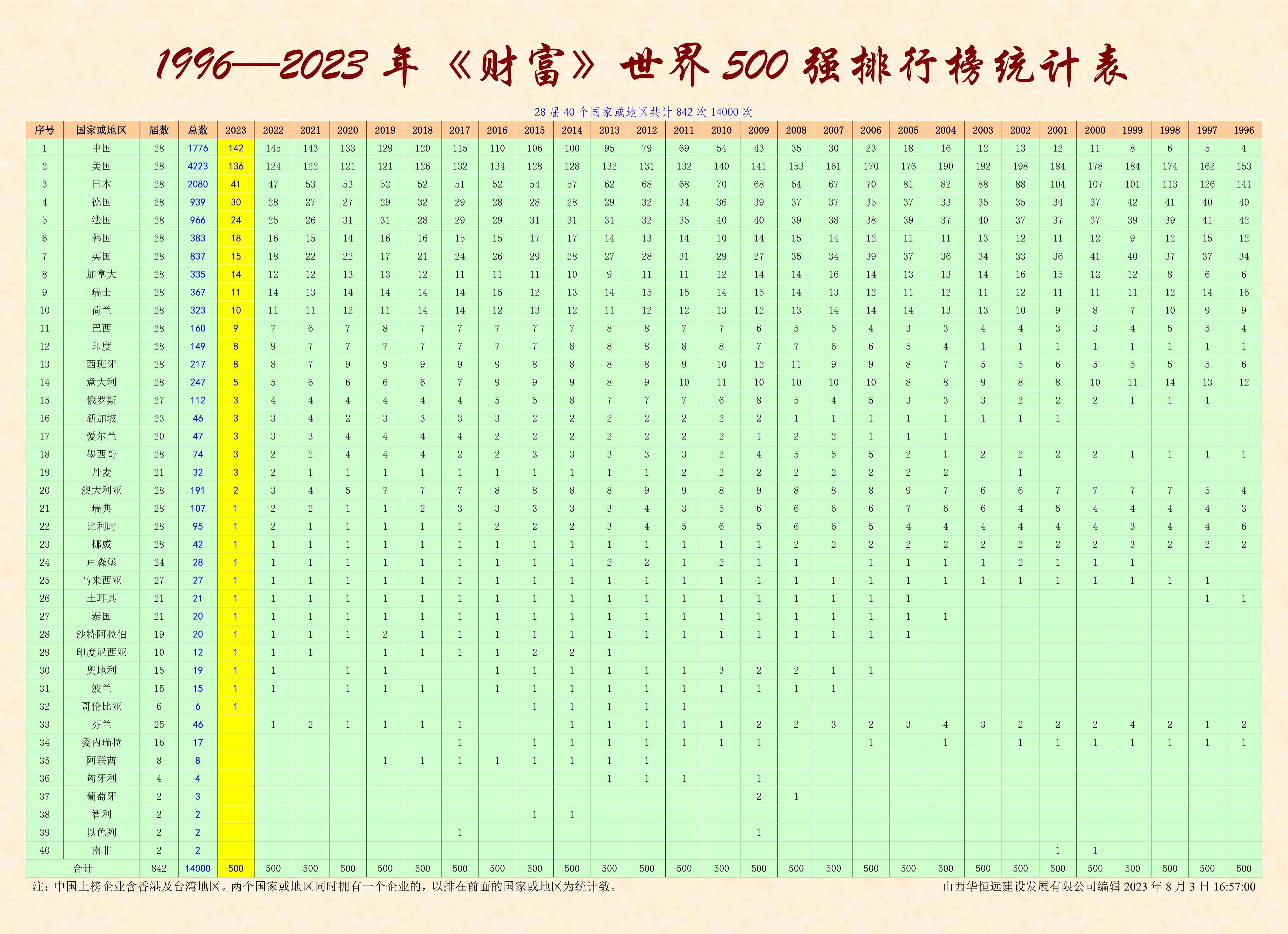8月2日,2023年《財(cái)富》世界500強(qiáng)排行榜公布。榜單顯示,今年上榜的中國(guó)企業(yè)(含臺(tái)灣地區(qū)企業(yè))數(shù)量達(dá)142家,超過(guò)美國(guó)(136家)。躋身世界500強(qiáng)榜單的中國(guó)企業(yè)數(shù)量繼續(xù)領(lǐng)跑全球。